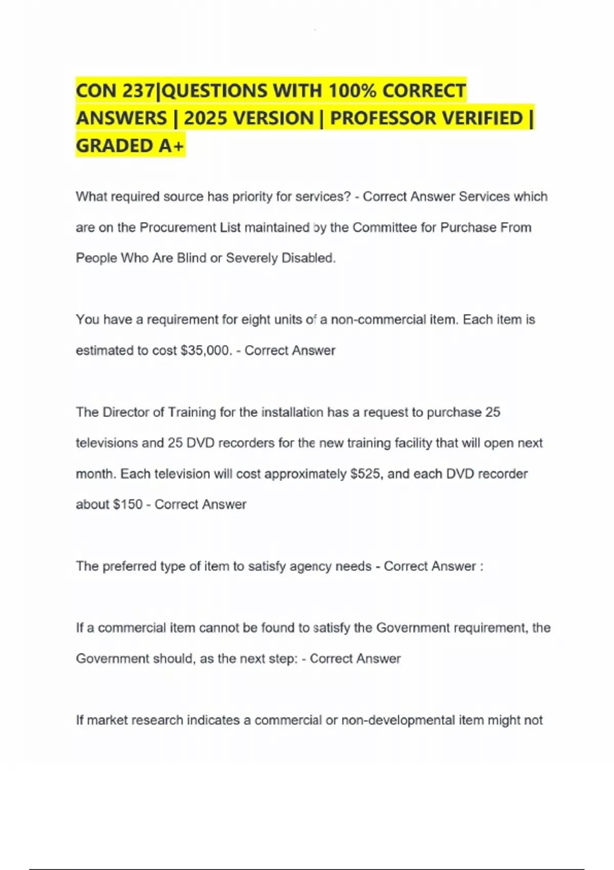 CON 237|QUESTIONS WITH 100% CORRECT ANSWERS | 2025 VERSION | PROFESSOR VERIFIED | GRADED A+ What required source has priority for services? - Correct Answer Services which are on the Procurement List maintained by the Committee for Purchase From People Who Are Blind or Severely Disabled. You have a requirement for eight units of a non-commercial item. Each item is estimated to cost $35,000. - Correct Answer The Director of Training for the installation has a request to purchase 25 televisions and 25 DVD recorders for the new training facility that will open next month. Each television will cost approximately $525, and each DVD recorder about $150 - Correct Answer The preferred type of item to satisfy agency needs - Correct Answer : If a commercial item cannot be found to satisfy the Government requirement, the Government should, as the next step: - Correct Answer If market research indicates a commercial or non-developmental item might not be available to satisfy agency needs: - Correct Answer You have a requirement for specific telecommunications components. A single telecommunications manufacturer provides these components to the general public. The estimated cost of these components is $145,000. - Correct Answer Simplified acquisition procedures can be used.