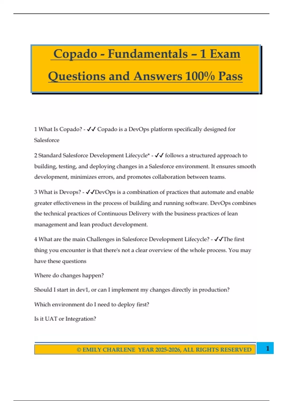 Copado - Fundamentals – 1 Exam Questions and Answers 100% Pass 1 What Is Copado? - Copado is a DevOps platform specifically designed for Salesforce 2 Standard Salesforce Development Lifecycle* - follows a structured approach to building, testing, and deploying changes in a Salesforce environment. It ensures smooth development, minimizes errors, and promotes collaboration between teams. 3 What is Devops? - DevOps is a combination of practices that automate and enable greater effectiveness in the process of building and running software. DevOps combines the technical practices of Continuous Delivery with the business practices of lean management and lean product development. 4 What are the main Challenges in Salesforce Development Lifecycle? - The first thing you encounter is that there's not a clear overview of the whole process. You may have these questions Where do changes happen? Should I start in dev1, or can I implement my changes directly in production? Which environment do I need to deploy first? Is it UAT or Integration? 2© EMILY CHARLENE YEAR , ALL RIGHTS RESERVED Who is going to approve my changes? 5 what are the limitations of the change sets? - Change Sets Limitations - Companies spend a lot of time building change sets. Here are some of the limitations of change sets that you should know: 1.Change sets do not offer the capability to search components by name or type. As a developer, you are forced to browse through multiple pages to find the metadata items you want to select. 2.If you accidentally add a component, you cannot filter within your selections to remove the component quickly. 3.Certain components are not available to be deployed using change sets, and it's possible to move changes only across environments that are connected. 4.With change sets, all selected components come in a single list, so you can't scope which modification is based on which request 5. Change sets do not enable continuous delivery, and automation of deployments is not an easy task 6 What are the difficulties Keeping Environments in Sync? - Release teams struggle with sandbox syncing after deploying to higher environments. For example, if a company uses a hotfix sandbox to develop and push fixes to production, lower environments will show discrepancies regarding the production environment. These differences can lead to deployment errors and a blocked pipeline. Even having multiple developer environments requires users to keep those environments in sync. 7 What are the Problems arise if we refresh the sandboxes.? - 1. Metadata loss. All the work in progress in a sandbox will be overwritten after the refresh. 3© EMILY CHARLENE YEAR , ALL RIGHTS RESERVED 2. Full sandboxes can only be refreshed once per month, therefore they can't easily receive changes that were sent from a hotfix environment to production. 3. Scrambled emails. Whenever a sandbox is refreshed, user email addresses are modified in the sandbox so that production users don't receive automatically generated email messages from the sandbox. Hence, users are required to validate an email address change in order to be able to log in again into the sandbox. 4.Data loss. Unless you're refreshing a full sandbox or a partial copy, you will lose all data. Hence, you need to recreate the test data all over again. 8 What happens If multiple Developers working on the same components? - "There is a major issue when multiple developers work in the same environment and perform changes in the same components. As mentioned in the Change Sets Limitations section, when you work with change sets, you have no visibility on who has made what changes, and there are no tools for you to foresee if your changes will be overwritten. 9 Why salesforce Deployment is Difficulty for the teams to colla