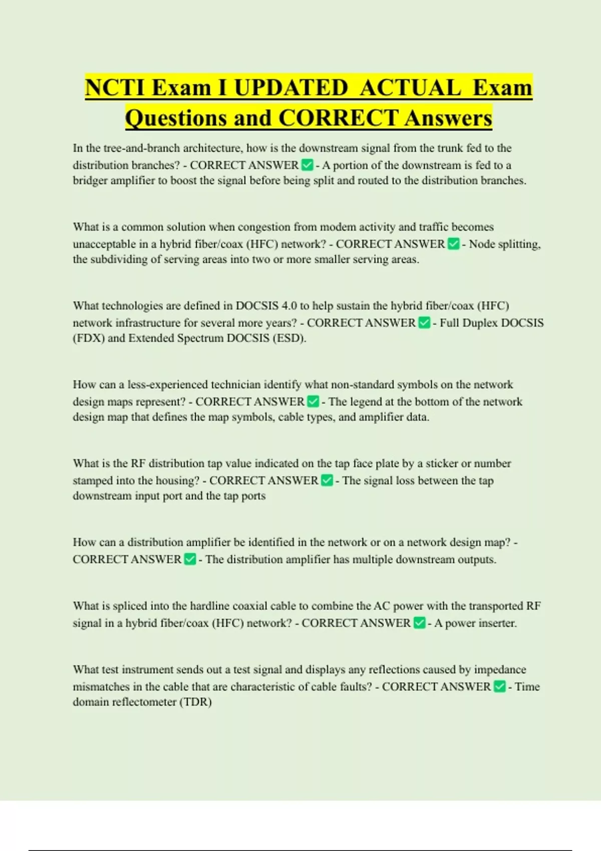 NCTI Exam I UPDATED ACTUAL Exam Questions and CORRECT Answers In the tree-and-branch architecture, how is the downstream signal from the trunk fed to the distribution branches? - CORRECT ANSWER - A portion of the downstream is fed to a bridger amplifier to boost the signal before being split and routed to the distribution branches. What is a common solution when congestion from modem activity and traffic becomes unacceptable in a hybrid fiber/coax (HFC) network? - CORRECT ANSWER - Node splitting, the subdividing of serving areas into two or more smaller serving areas.