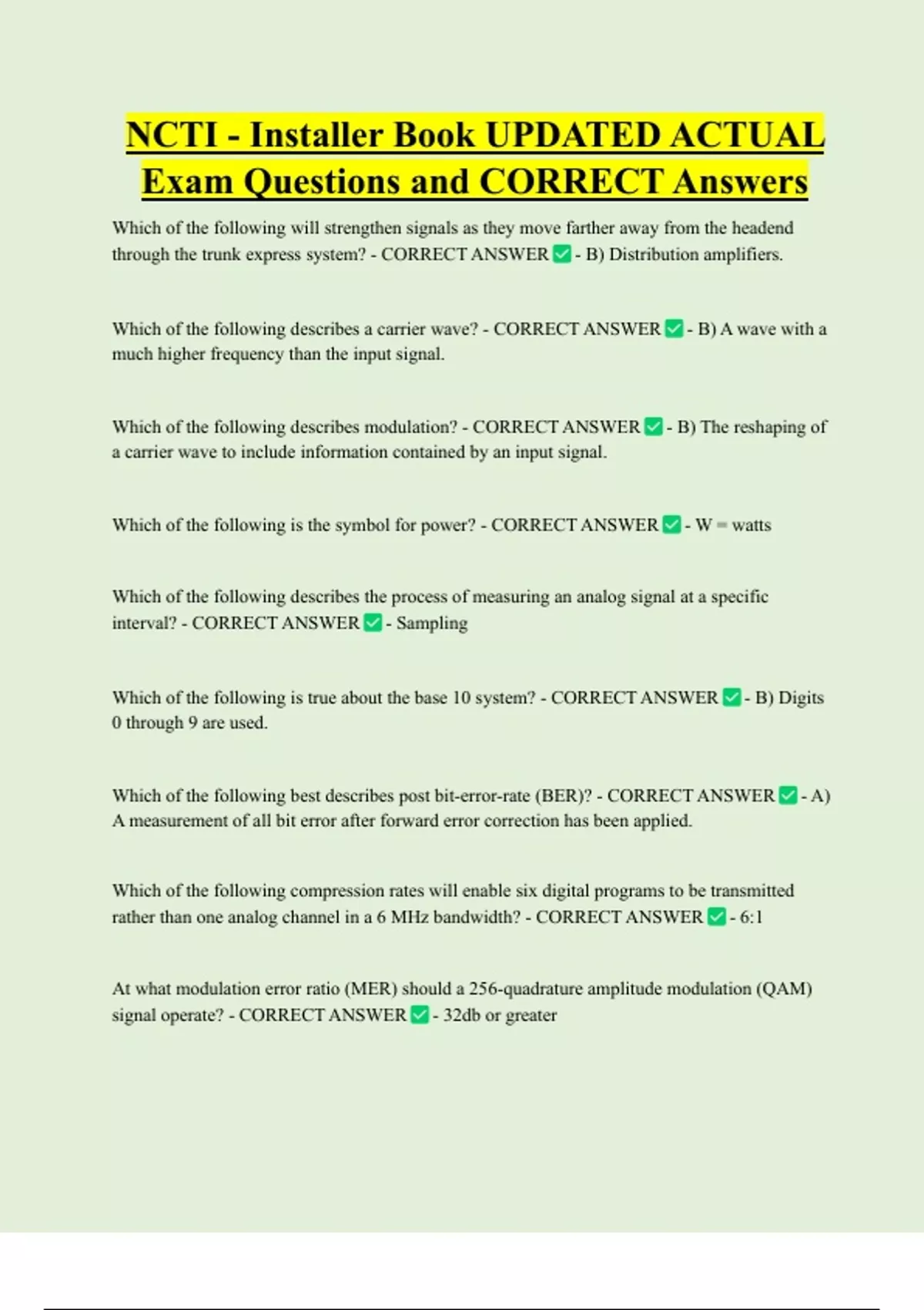 NCTI - Installer Book UPDATED ACTUAL Exam Questions and CORRECT Answers Which of the following will strengthen signals as they move farther away from the headend through the trunk express system? - CORRECT ANSWER - B) Distribution amplifiers. Which of the following describes a carrier wave? - CORRECT ANSWER - B) A wave with a much higher frequency than the input signal. Which of the following describes modulation? - CORRECT ANSWER - B) The reshaping of a carrier wave to include information contained by an input signal.