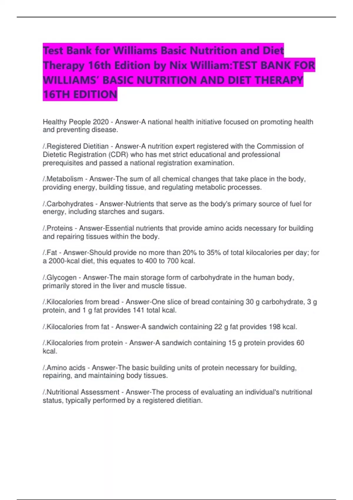 Test Bank for Williams Basic Nutrition and Diet Therapy 16th Edition by Nix William:TEST BANK FOR WILLIAMS’ BASIC NUTRITION AND DIET THERAPY 16TH EDITION Healthy People 2020 - Answer-A national health initiative focused on promoting health and preventing disease. /.Registered Dietitian - Answer-A nutrition expert registered with the Commission of Dietetic Registration (CDR) who has met strict educational and professional prerequisites and passed a national registration examination. /.Metabolism - Answer-The sum of all chemical changes that take place in the body, providing energy, building tissue, and regulating metabolic processes. /.Carbohydrates - Answer-Nutrients that serve as the body's primary source of fuel for energy, including starches and sugars. /.Proteins - Answer-Essential nutrients that provide amino acids necessary for building and repairing tissues within the body. /.Fat - Answer-Should provide no more than 20% to 35% of total kilocalories per day; for a 2000-kcal diet, this equates to 400 to 700 kcal. /.Glycogen - Answer-The main storage form of carbohydrate in the human body, primarily stored in the liver and muscle tissue. /.Kilocalories from bread - Answer-One slice of bread containing 30 g carbohydrate, 3 g protein, and 1 g fat provides 141 total kcal. /.Kilocalories from fat - Answer-A sandwich containing 22 g fat provides 198 kcal. /.Kilocalories from protein - Answer-A sandwich containing 15 g protein provides 60 kcal. /.Amino acids - Answer-The basic building units of protein necessary for building, repairing, and maintaining body tissues. /.Nutritional Assessment - Answer-The process of evaluating an individual's nutritional status, typically performed by a registered dietitian. /.Primary fuel source - Answer-Carbohydrates are the primary fuel source for the body, with fat serving as a secondary source. /.Nutrition - Answer-The process of providing or obtaining the food necessary for health and growth. /.Dietary Fats - Answer-Nutrients that provide energy and are essential for the absorption of certain vitamins. /.Vitamins - Answer-Organic compounds that are crucial for various metabolic processes in the body. /.Minerals - Answer-Inorganic elements that play a role in various bodily functions, including metabolic regulation. /.Fiber - Answer-A type of carbohydrate that the body cannot digest, important for digestive health. /.Energy balance - Answer-The relationship between energy intake and energy expenditure. /.Nutrient density - Answer-A measure of the nutrients a food contains in relation to its energy content. /.Hydration - Answer-The process of providing adequate fluids to maintain bodily functions. /.Caloric intake - Answer-The total number of calories consumed through food and beverages. /.Dietary guidelines - Answer-Recommendations for healthy eating patterns and physical activity. /.Malnutrition - Answer-A condition resulting from an imbalanced diet, either too much or too little of certain nutrients. /.Nutritional deficiencies - Answer-Health problems that arise from a lack of essential nutrients in the diet. /.Dietary assessment methods - Answer-Tools and techniques used to evaluate an individual's dietary intake and nutritional status. /.Food security - Answer-The state of having reliable access to a sufficient quantity of affordable, nutritious food. /.Coenzyme factors - Answer-Components aiding enzymes in metabolic reactions.