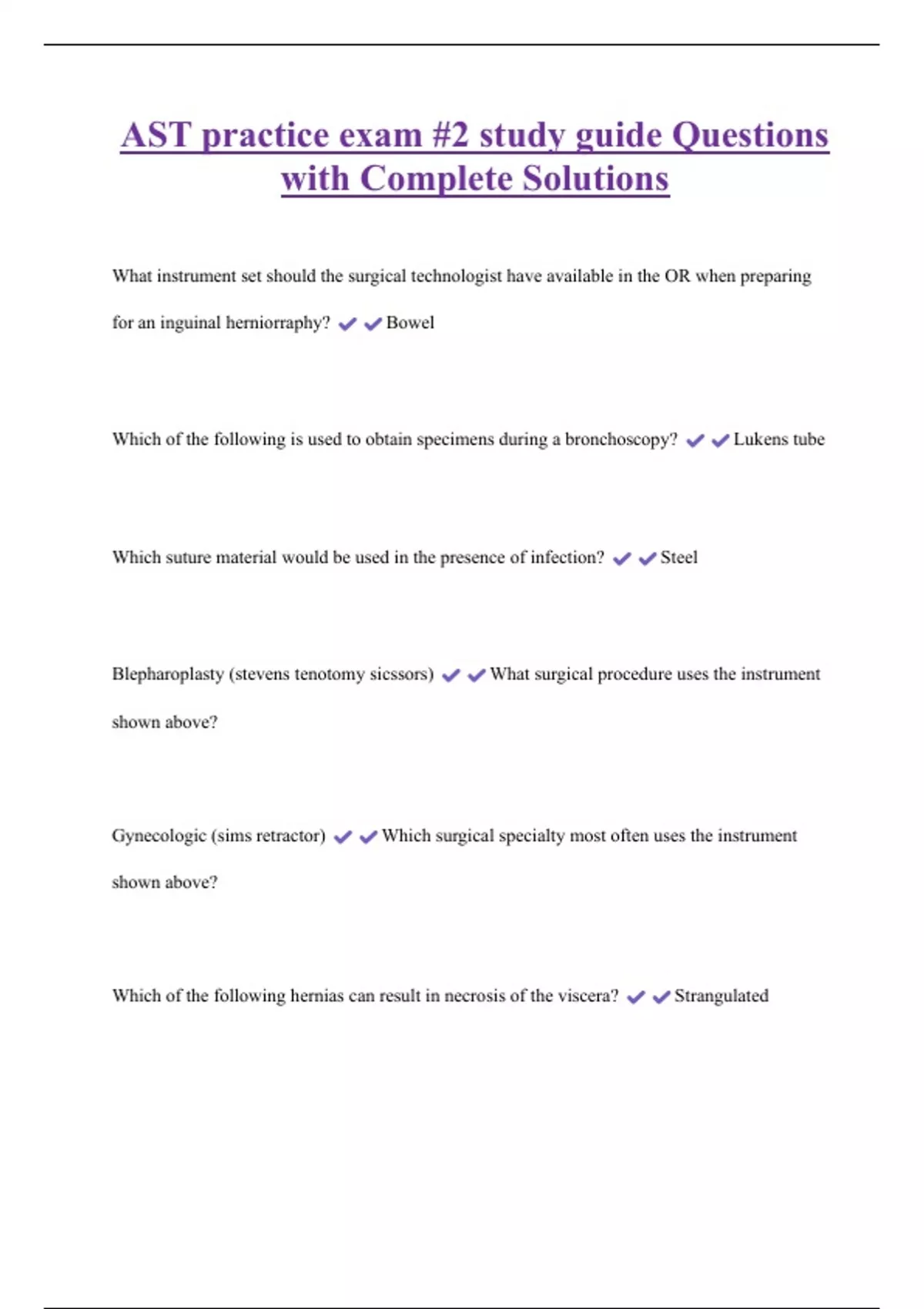 AST practice exam #2 study guide Questions with Complete Solutions What instrument set should the surgical technologist have available in the OR when preparing for an inguinal herniorraphy? Bowel Which of the following is used to obtain specimens during a bronchoscopy? Lukens tube Which suture material would be used in the presence of infection? Steel Blepharoplasty (stevens tenotomy sicssors) What surgical procedure uses the instrument shown above?