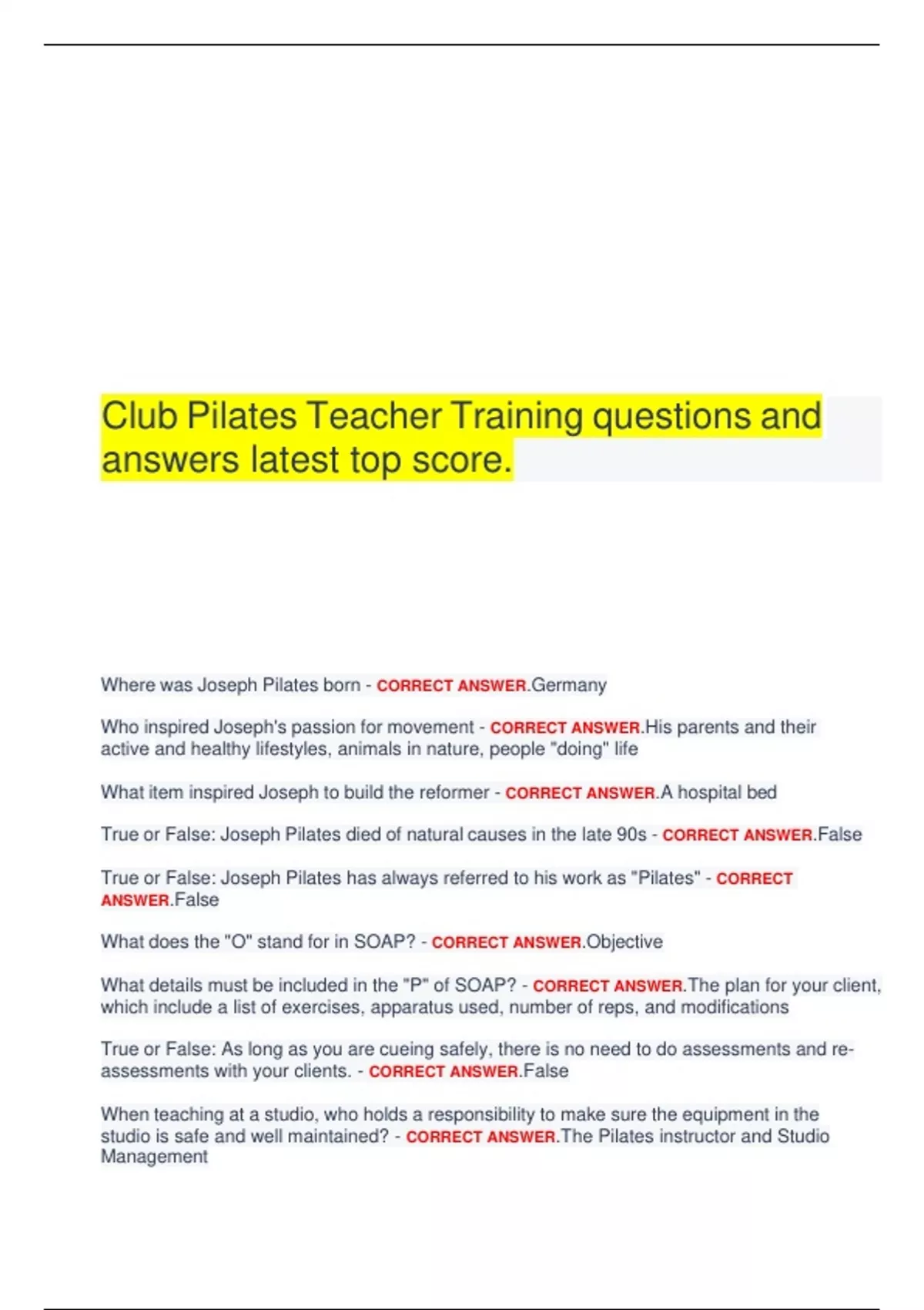 Club Pilates Teacher Training questions and answers latest top score