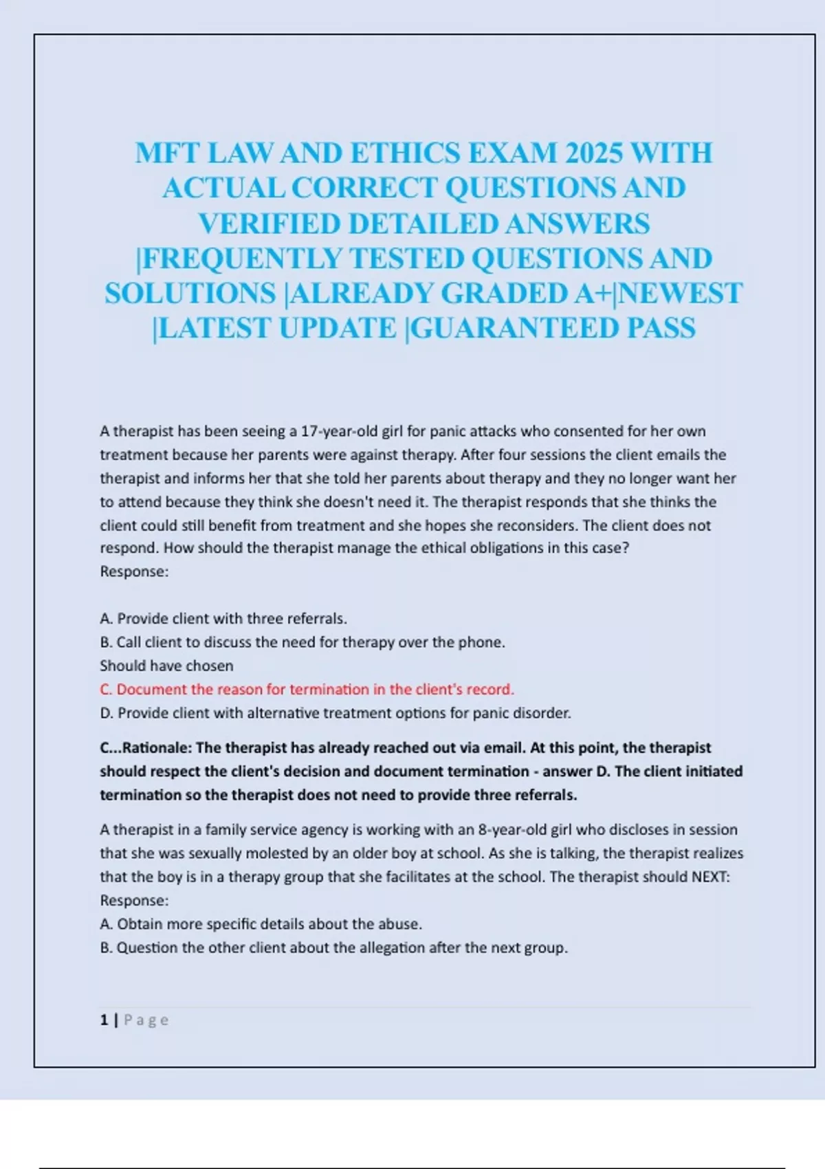 MFT LAW AND ETHICS EXAM 2025 WITH ACTUAL CORRECT QUESTIONS AND VERIFIED DETAILED ANSWERS |FREQUENTLY TESTED QUESTIONS AND SOLUTIONS |ALREADY GRADED A+|NEWEST |LATEST UPDATE |GUARANTEED PASS