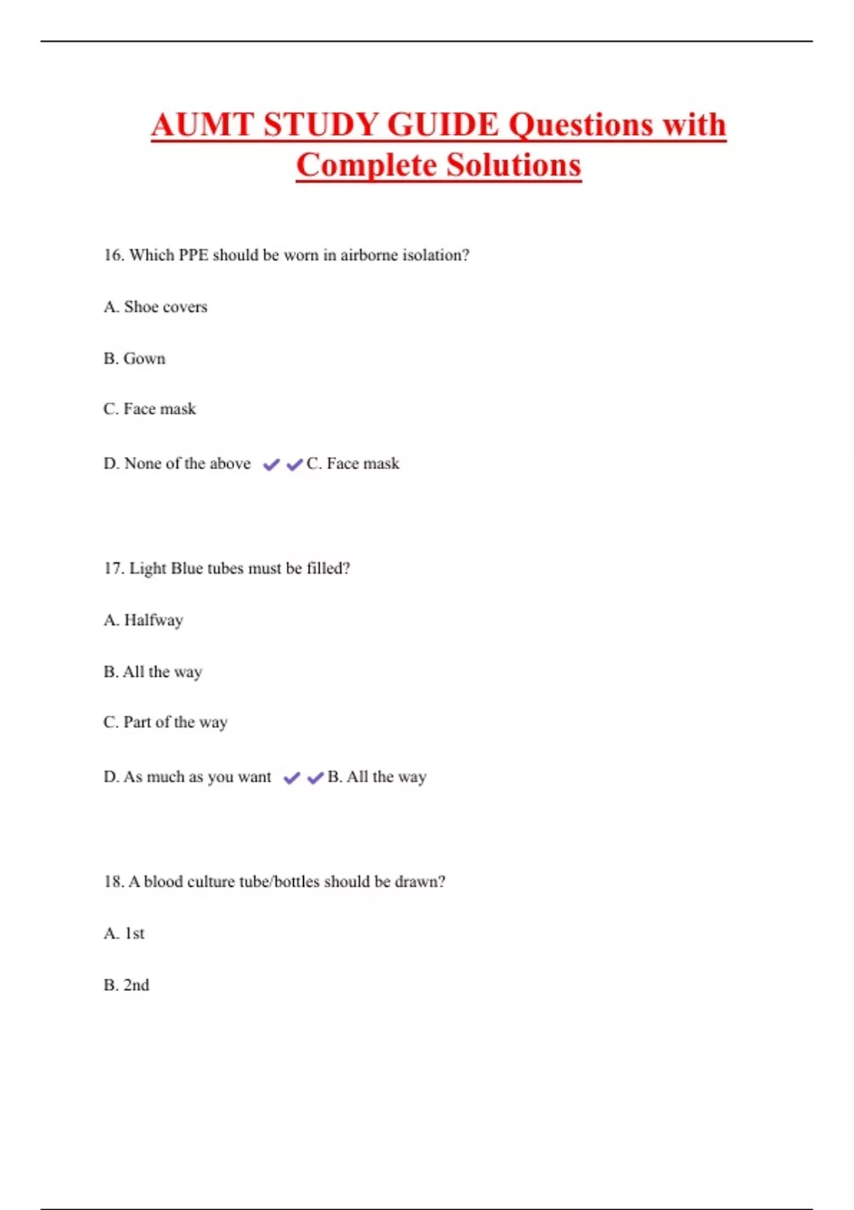 AUMT STUDY GUIDE Questions with Complete Solutions 16. Which PPE should be worn in airborne isolation? A. Shoe covers B. Gown C. Face mask D. None of the above C. Face mask 17. Light Blue tubes must be filled? A. Halfway B. All the way C. Part of the way D. As much as you want B. All the way