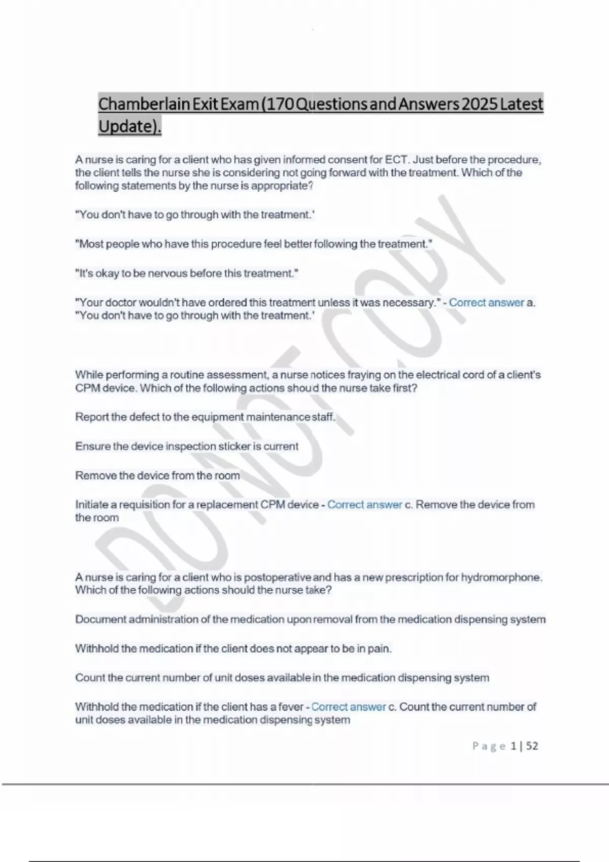 chamberlain exit exam 170 questions and answers 2