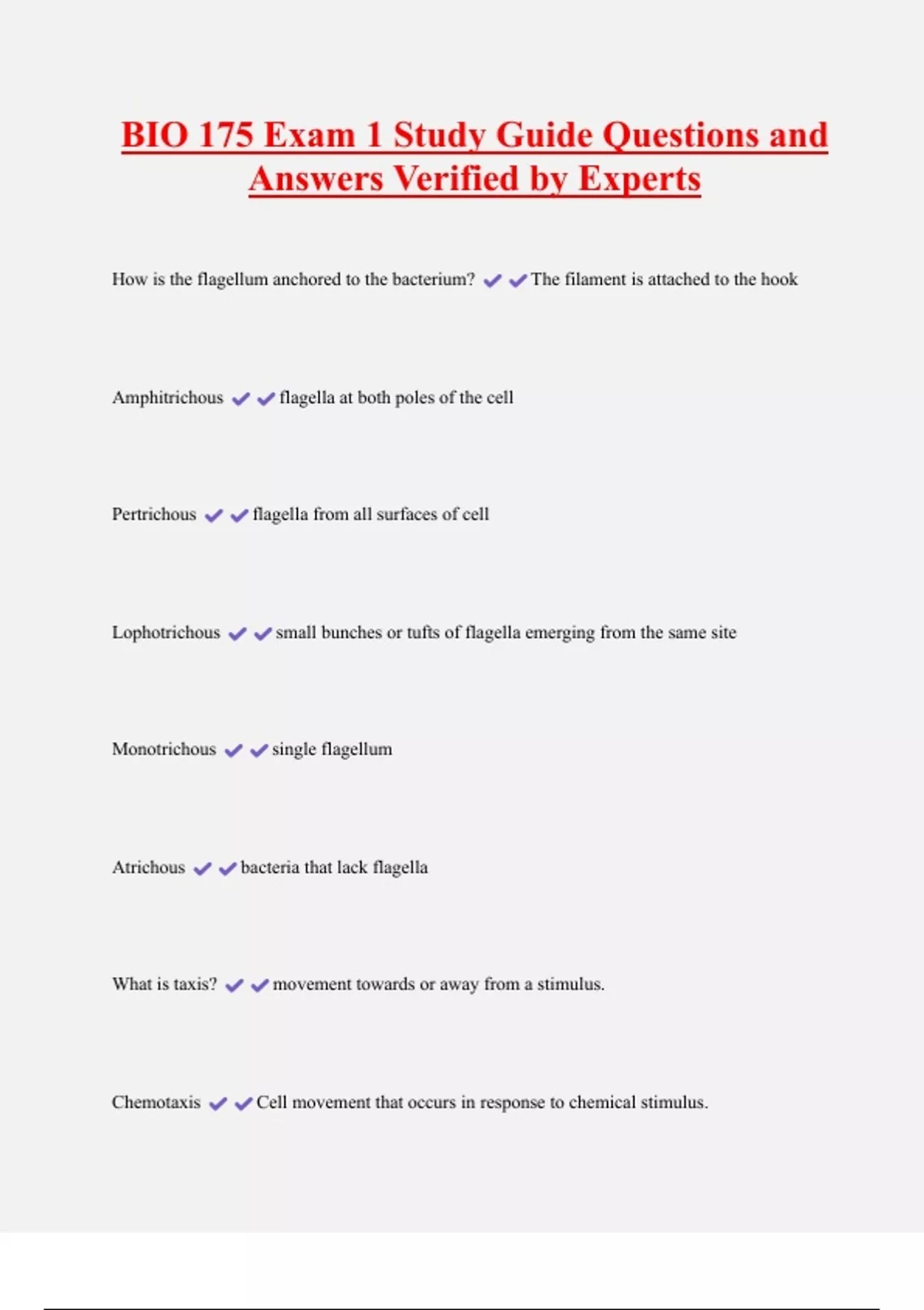 BIO 175 Exam 1 Study Guide Questions and Answers Verified by Experts