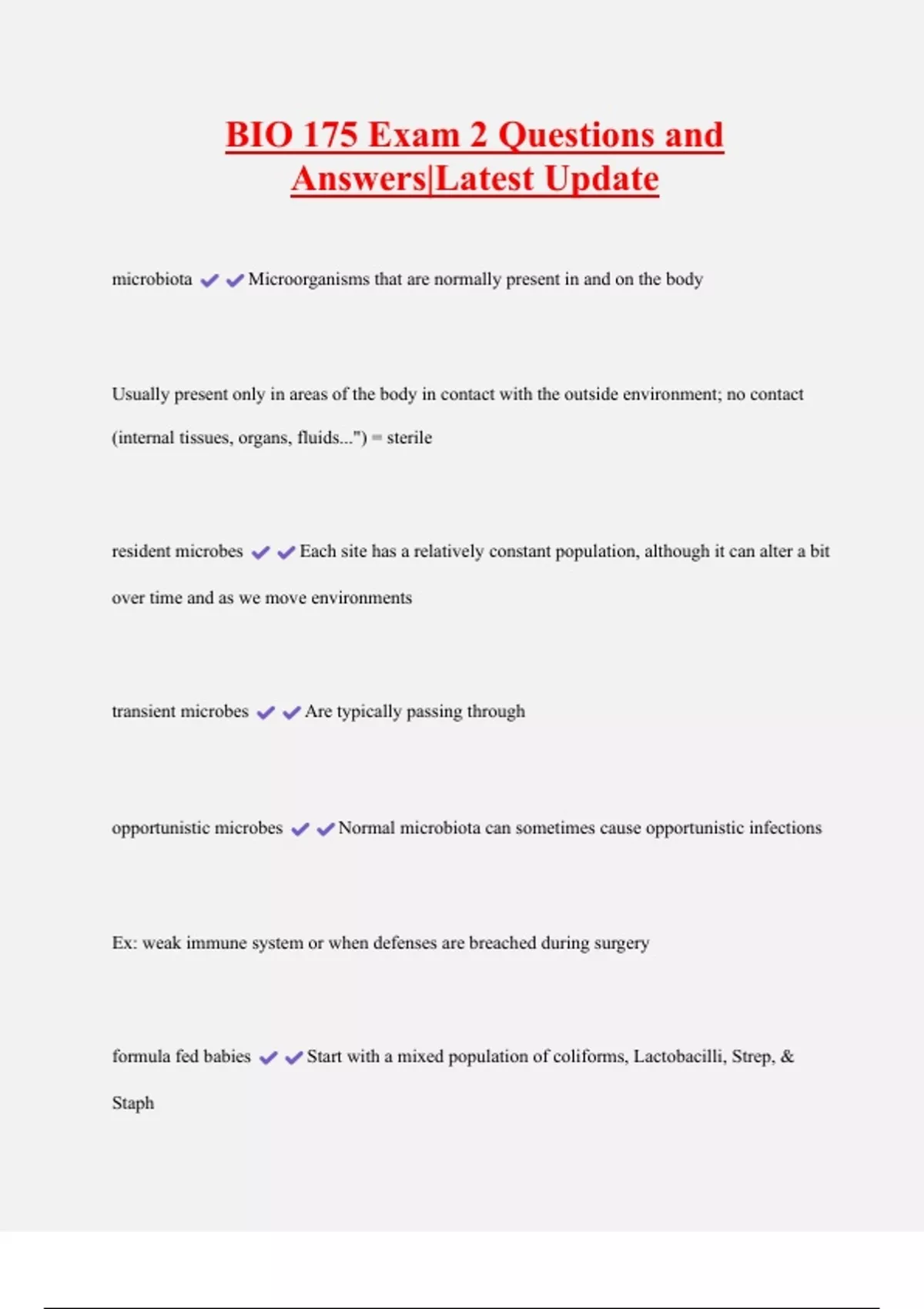 BIO 175 Exam 2 Questions and Answers|Latest Update microbiota Microorganisms that are normally present in and on the body Usually present only in areas of the body in contact with the outside environment; no contact (internal tissues, organs, fluids...") = sterile resident microbes Each site has a relatively constant population, although it can alter a bit over time and as we move environments transient microbes Are typically passing through opportunistic microbes Normal microbiota can sometimes cause opportunistic infections