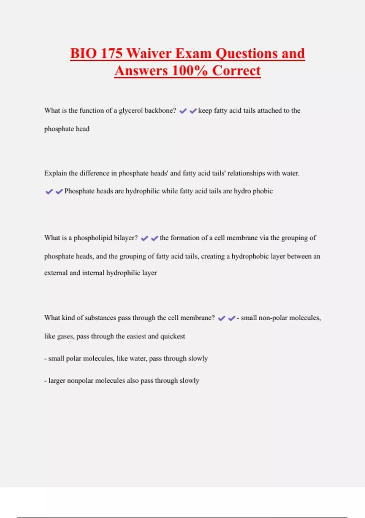 BIO 175 Waiver Exam Questions and Answers 100% Correct What is the function of a glycerol backbone? keep fatty acid tails attached to the phosphate head Explain the difference in phosphate heads' and fatty acid tails' relationships with water. Phosphate heads are hydrophilic while fatty acid tails are hydro phobic What is a phospholipid bilayer? the formation of a cell membrane via the grouping of phosphate heads, and the grouping of fatty acid tails, creating a hydrophobic layer between an external and internal hydrophilic layer