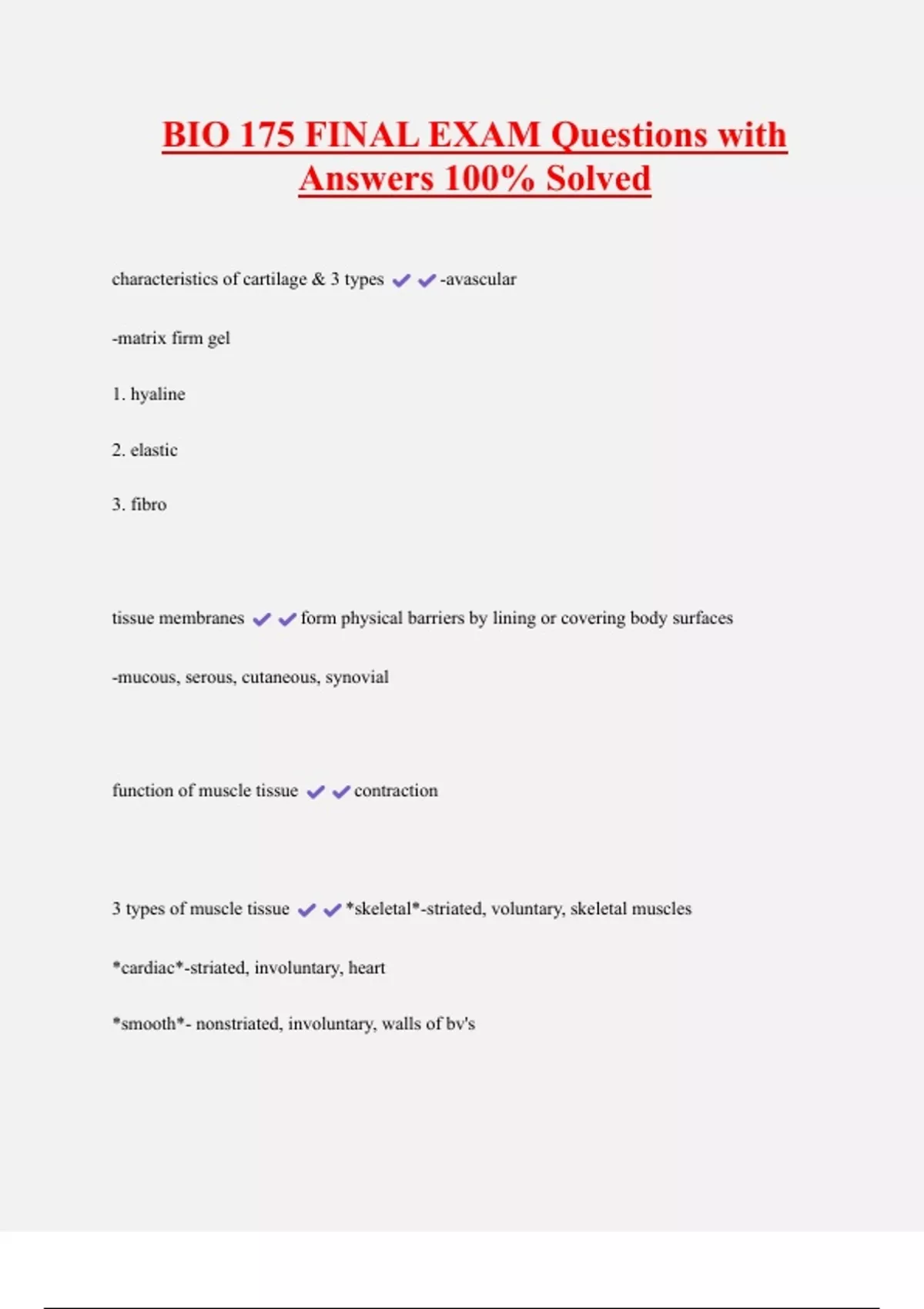 BIO 175 FINAL EXAM Questions with Answers 100% Solved characteristics of cartilage & 3 types -avascular -matrix firm gel 1. hyaline 2. elastic 3. fibro tissue membranes form physical barriers by lining or covering body surfaces -mucous, serous, cutaneous, synovial function of muscle tissue contraction
