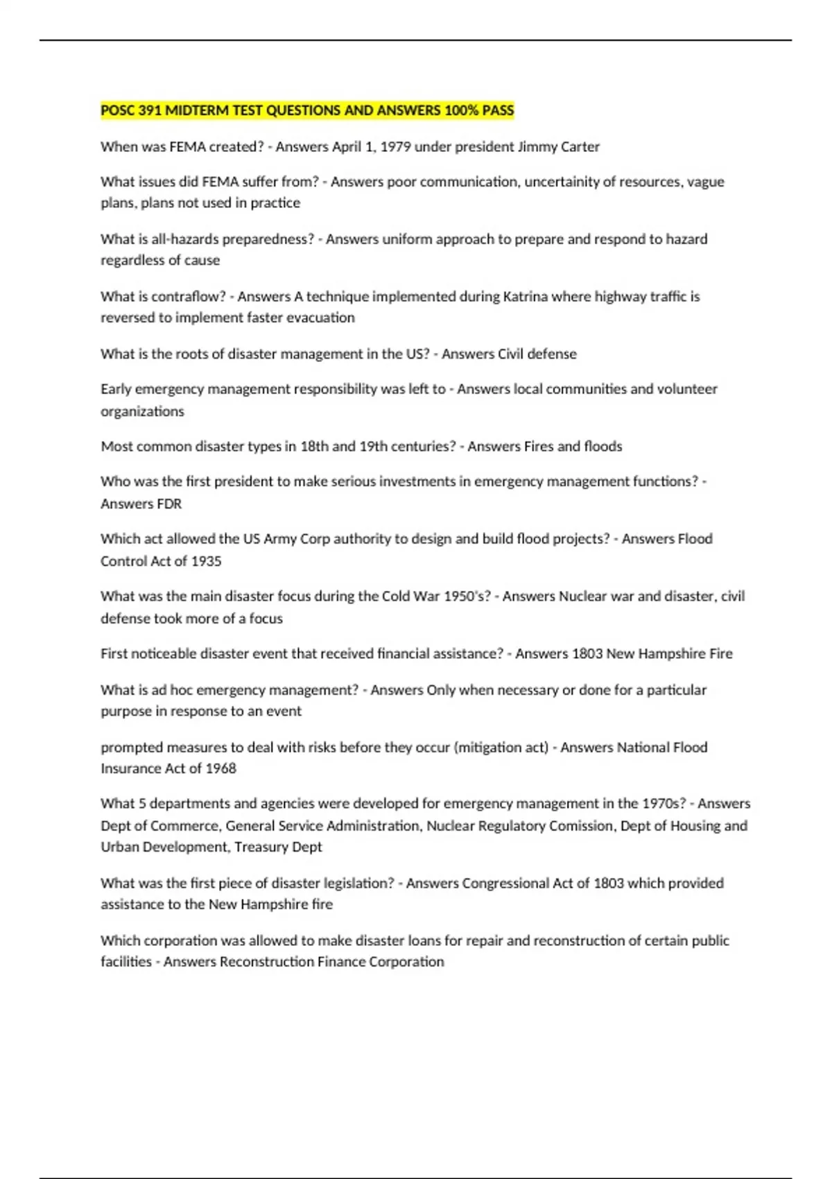 POSC 391 MIDTERM TEST QUESTIONS AND ANSWERS 100% PASS When was FEMA created? - Answers April 1, 1979 under president Jimmy Carter What issues did FEMA suffer from? - Answers poor communication, uncertainity of resources, vague plans, plans not used in practice What is all-hazards preparedness? - Answers uniform approach to prepare and respond to hazard regardless of cause What is contraflow? - Answers A technique implemented during Katrina where highway traffic is reversed to implement faster evacuation What is the roots of disaster management in the US? - Answers Civil defense Early emergency management responsibility was left to - Answers local communities and volunteer organizations Most common disaster types in 18th and 19th centuries? - Answers Fires and floods Who was the first president to make serious investments in emergency management functions? - Answers FDR Which act allowed the US Army Corp authority to design and build flood projects? - Answers Flood Control Act of 1935 What was the main disaster focus during the Cold War 1950's? - Answers Nuclear war and disaster, civil defense took more of a focus First noticeable disaster event that received financial assistance? - Answers 1803 New Hampshire Fire What is ad hoc emergency management? - Answers Only when necessary or done for a particular purpose in response to an event prompted measures to deal with risks before they occur (mitigation act) - Answers National Flood Insurance Act of 1968 What 5 departments and agencies were developed for emergency management in the 1970s? - Answers Dept of Commerce, General Service Administration, Nuclear Regulatory Comission, Dept of Housing and Urban Development, Treasury Dept What was the first piece of disaster legislation? - Answers Congressional Act of 1803 which provided assistance to the New Hampshire fire Which corporation was allowed to make disaster loans for repair and reconstruction of certain public facilities - Answers Reconstruction Finance Corporation What is FEMA's mission statement? - Answers "to lead America to prepare for, prevent, respond to and recover from disasters with a vision of 'A Nation Prepared' Which FEMA director helped to restore their reputation? - Answers James Lee Witt Most important piece of Disaster legislature? - Answers The Stafford Act How did Witt improve FEMA? - Answers Reorganization, better employee training, new technology and improved facilities, independent agency status for FEMA, intergovernmental cooperation What is a large problem for emergency managers considering citizens? - Answers Citizens for a multitude of reasons will often ignore evacuation orders