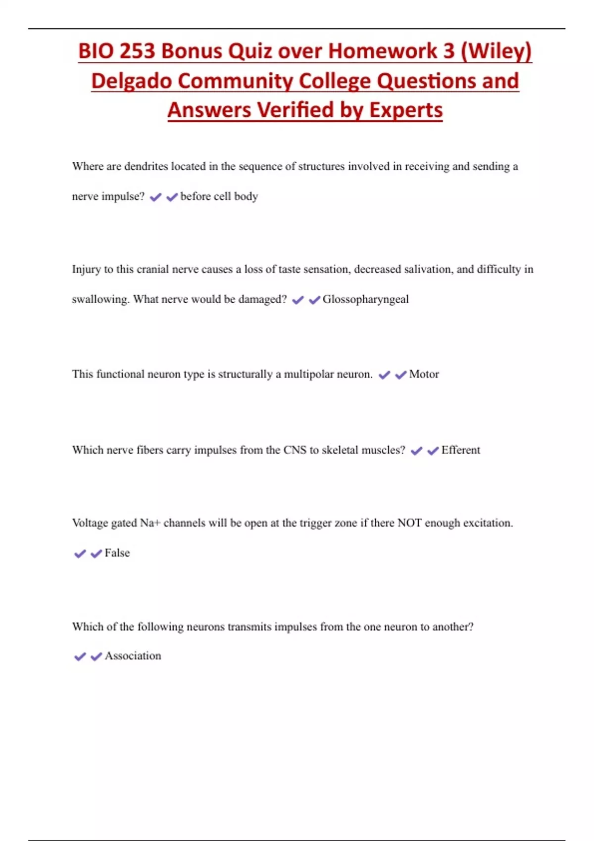 BIO 253 Bonus Quiz over Homework 3 (Wiley) Delgado Community College Questions and Answers Verified by Experts