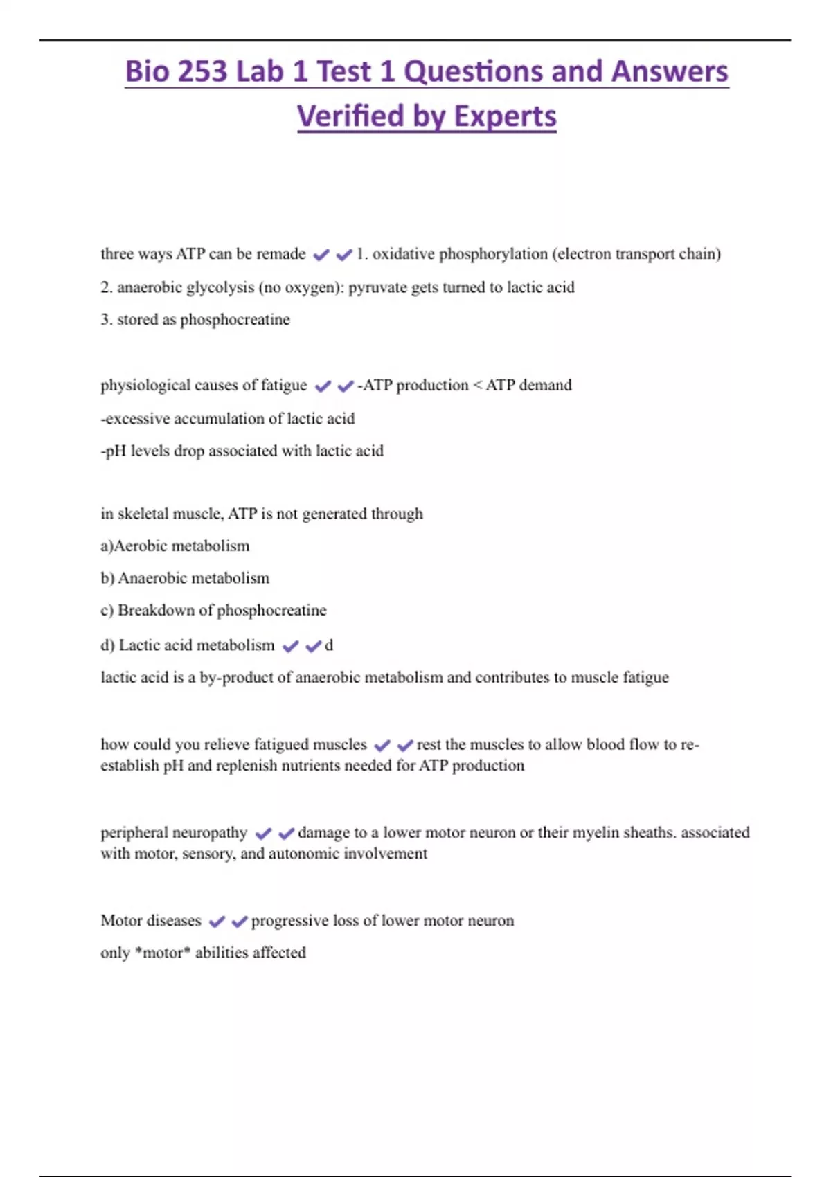 Bio 253 Lab 1 Test 1 Questions and Answers Verified by Experts three ways ATP can be remade 1. oxidative phosphorylation (electron transport chain) 2. anaerobic glycolysis (no oxygen): pyruvate gets turned to lactic acid 3. stored as phosphocreatine physiological causes of fatigue -ATP production ATP demand -excessive accumulation of lactic acid -pH levels drop associated with lactic acid in skeletal muscle, ATP is not generated through a)Aerobic metabolism b) Anaerobic metabolism c) Breakdown of phosphocreatine d) Lactic acid metabolism d lactic acid is a by-product of anaerobic metabolism and contributes to muscle fatigue