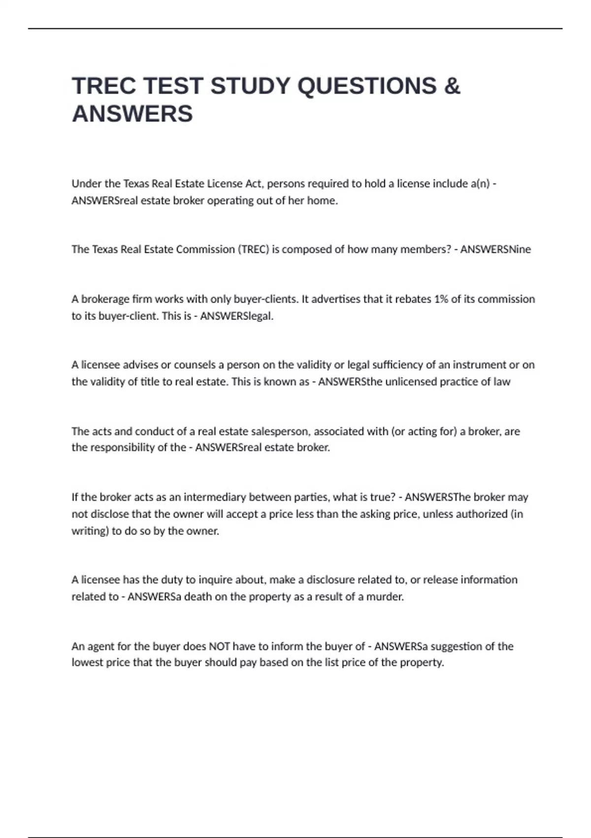 TREC TEST STUDY QUESTIONS & ANSWERS Under the Texas Real Estate License Act, persons required to hold a license include a(n) - ANSWERSreal estate broker operating out of her home. The Texas Real Estate Commission (TREC) is composed of how many members? - ANSWERSNine A brokerage firm works with only buyer-clients. It advertises that it rebates 1% of its commission to its buyer-client. This is - ANSWERSlegal. A licensee advises or counsels a person on the validity or legal sufficiency of an instrument or on the validity of title to real estate. This is known as - ANSWERSthe unlicensed practice of law The acts and conduct of a real estate salesperson, associated with (or acting for) a broker, are the responsibility of the - ANSWERSreal estate broker. If the broker acts as an intermediary between parties, what is true? - ANSWERSThe broker may not disclose that the owner will accept a price less than the asking price, unless authorized (in writing) to do so by the owner. A licensee has the duty to inquire about, make a disclosure related to, or release information related to - ANSWERSa death on the property as a result of a murder. An agent for the buyer does NOT have to inform the buyer of - ANSWERSa suggestion of the lowest price that the buyer should pay based on the list price of the property.