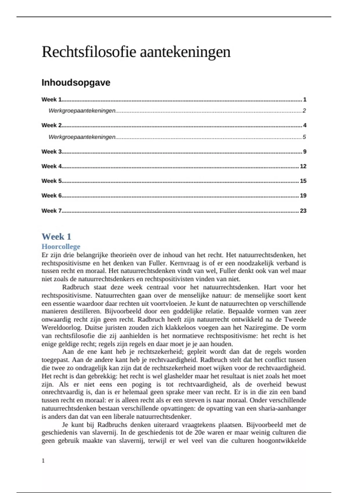 In dit samengestelde document staat het aantekeningenmateriaal van alle hoorcolleges (behalve hoorcollege 4) en werkgroepen voor Rechtsfilosofie, inclusief antwoordindicaties op de opdrachten.