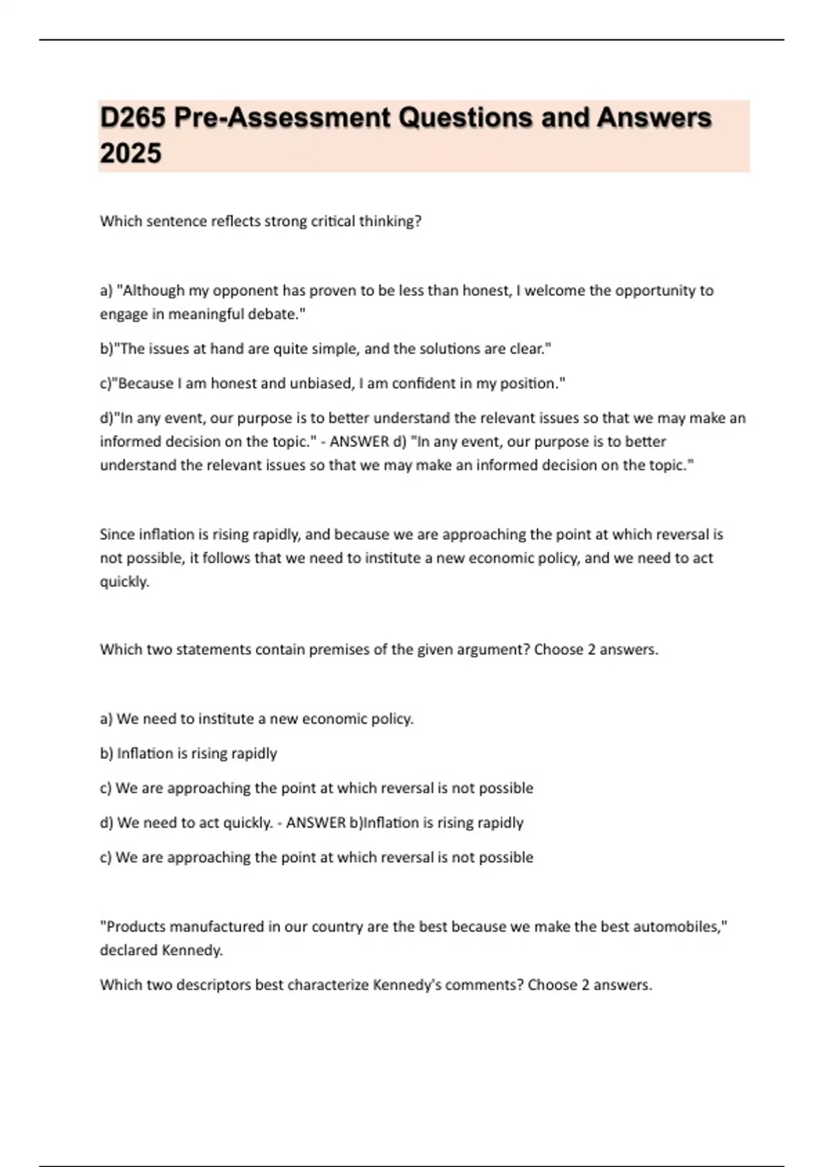 D265 Pre-Assessment Questions and Answers