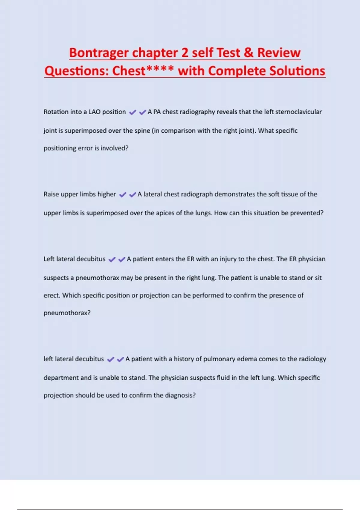 Bontrager chapter 2 self Test & Review Questions: Chest**** with Complete Solutions Rotation into a LAO position A PA chest radiography reveals that the left sternoclavicular joint is superimposed over the spine (in comparison with the right joint). What specific positioning error is involved? Raise upper limbs higher A lateral chest radiograph demonstrates the soft tissue of the upper limbs is superimposed over the apices of the lungs. How can this situation be prevented?