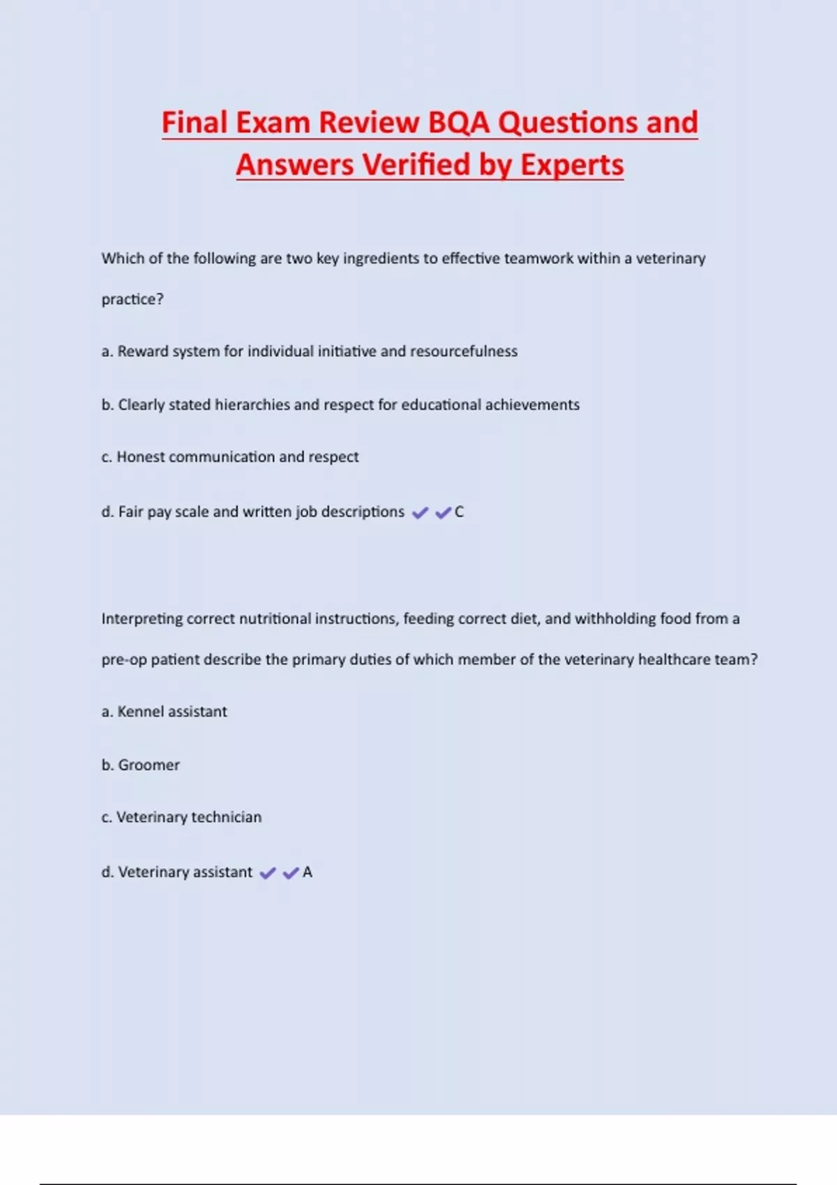 Final Exam Review BQA Questions and Answers Verified by Experts