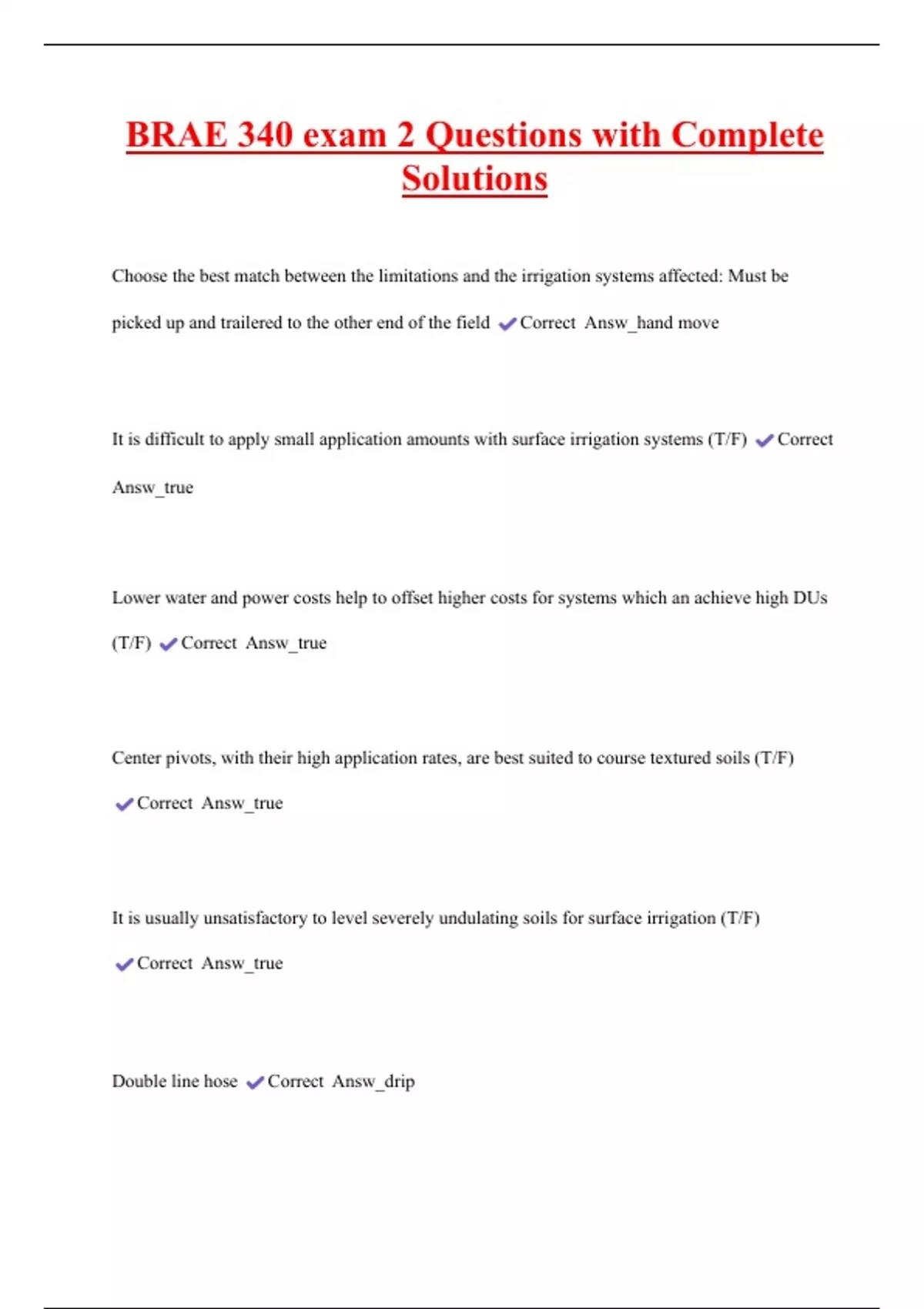 BRAE 340 exam 2 Questions with Complete Solutions Choose the best match between the limitations and the irrigation systems affected: Must be picked up and trailered to the other end of the field Correct Answ_hand move It is difficult to apply small application amounts with surface irrigation systems (T/F) Correct Answ_true Lower water and power costs help to offset higher costs for systems which an achieve high DUs (T/F) Correct Answ_true Center pivots, with their high application rates, are best suited to course textured soils (T/F) Correct Answ_true