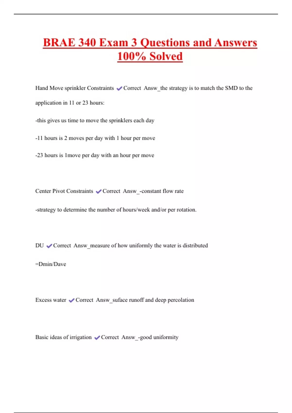 BRAE 340 Exam 3 Questions and Answers 100% Solved Hand Move sprinkler Constraints Correct Answ_the strategy is to match the SMD to the application in 11 or 23 hours: -this gives us time to move the sprinklers each day -11 hours is 2 moves per day with 1 hour per move -23 hours is 1move per day with an hour per move