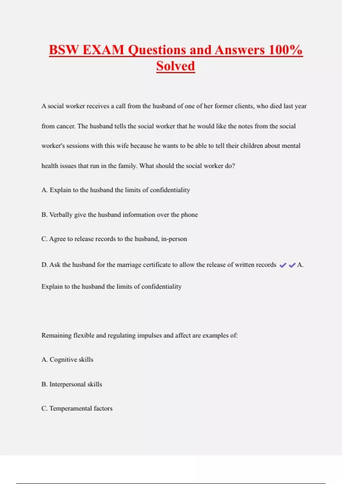 BSW EXAM Questions and Answers 100% Solved A social worker receives a call from the husband of one of her former clients, who died last year from cancer. The husband tells the social worker that he would like the notes from the social worker's sessions with this wife because he wants to be able to tell their children about mental health issues that run in the family. What should the social worker do? A. Explain to the husband the limits of confidentiality B. Verbally give the husband information over the phone C. Agree to release records to the husband, in-person D. Ask the husband for the marriage certificate to allow the release of written records A. Explain to the husband the limits of confidentiality