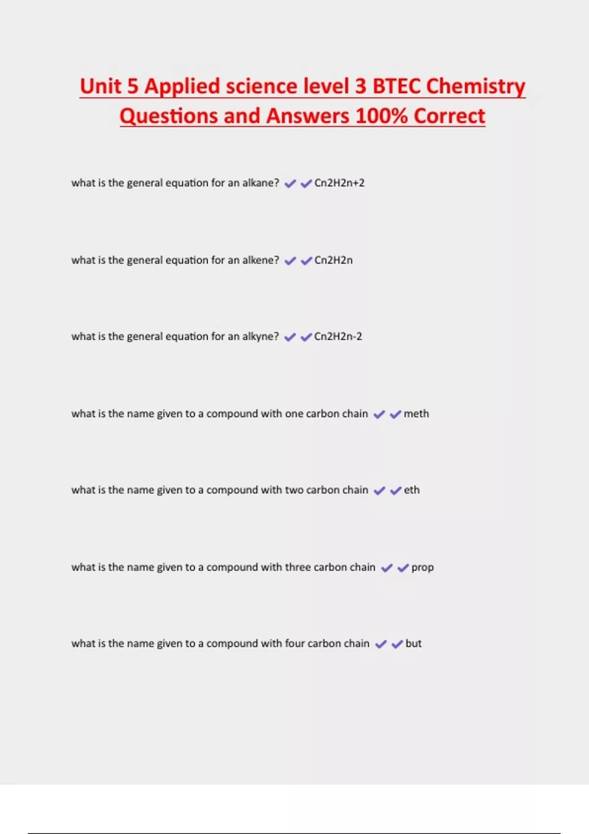 Unit 5 Applied science level 3 BTEC Chemistry Questions and Answers 100% Correct what is the general equation for an alkane? Cn2H2n+2 what is the general equation for an alkene? Cn2H2n what is the general equation for an alkyne? Cn2H2n-2 what is the name given to a compound with one carbon chain meth