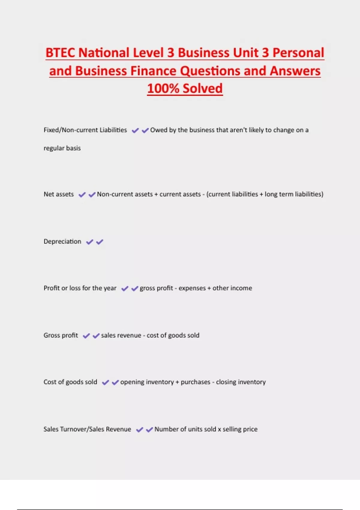 BTEC National Level 3 Business Unit 3 Personal and Business Finance Questions and Answers 100% Solved Fixed/Non-current Liabilities Owed by the business that aren't likely to change on a regular basis Net assets Non-current assets + current assets - (current liabilities + long term liabilities) Depreciation