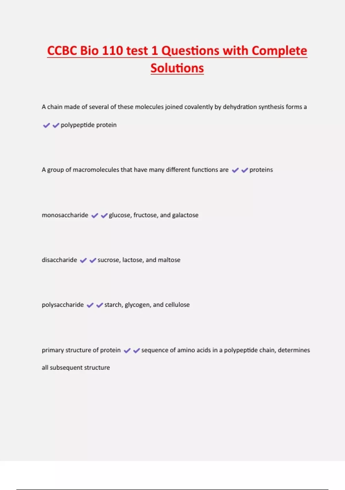 CCBC Bio 110 test 1 Questions with Complete Solutions A chain made of several of these molecules joined covalently by dehydration synthesis forms a polypeptide protein A group of macromolecules that have many different functions are proteins monosaccharide glucose, fructose, and galactose disaccharide sucrose, lactose, and maltose