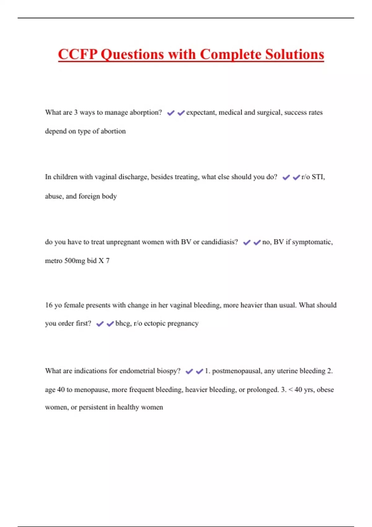 CCFP Questions with Complete Solutions What are 3 ways to manage aborption? expectant, medical and surgical, success rates depend on type of abortion In children with vaginal discharge, besides treating, what else should you do? r/o STI, abuse, and foreign body do you have to treat unpregnant women with BV or candidiasis? no, BV if symptomatic, metro 500mg bid X 7 16 yo female presents with change in her vaginal bleeding, more heavier than usual. What should you order first? bhcg, r/o ectopic pregnancy