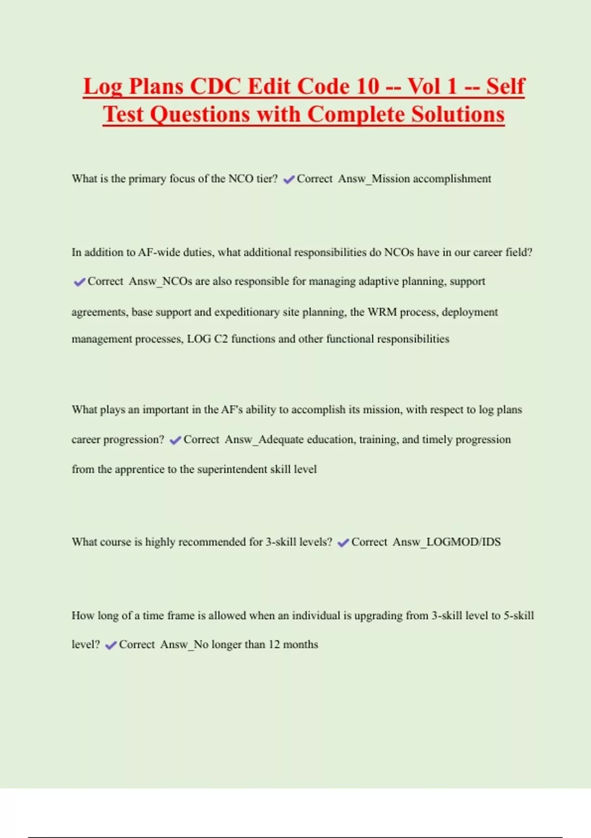 Log Plans CDC Edit Code 10 -- Vol 1 -- Self Test Questions with Complete Solutions What is the primary focus of the NCO tier? Correct Answ_Mission accomplishment In addition to AF-wide duties, what additional responsibilities do NCOs have in our career field? Correct Answ_NCOs are also responsible for managing adaptive planning, support agreements, base support and expeditionary site planning, the WRM process, deployment management processes, LOG C2 functions and other functional responsibilities What plays an important in the AF's ability to accomplish its mission, with respect to log plans career progression? Correct Answ_Adequate education, training, and timely progression from the apprentice to the superintendent skill lev