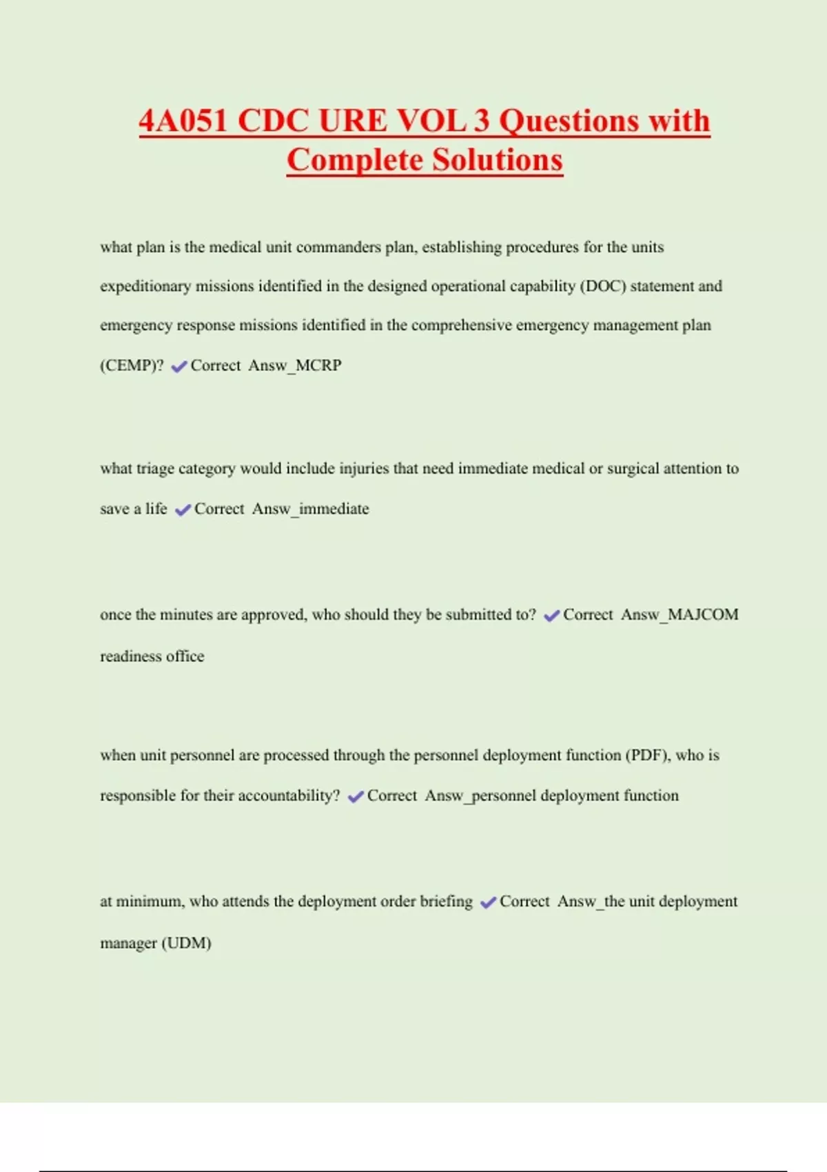 4A051 CDC URE VOL 3 Questions with Complete Solutions what plan is the medical unit commanders plan, establishing procedures for the units expeditionary missions identified in the designed operational capability (DOC) statement and emergency response missions identified in the comprehensive emergency management plan (CEMP)? Correct Answ_MCRP what triage category would include injuries that need immediate medical or surgical attention to save a life Correct Answ_immediate