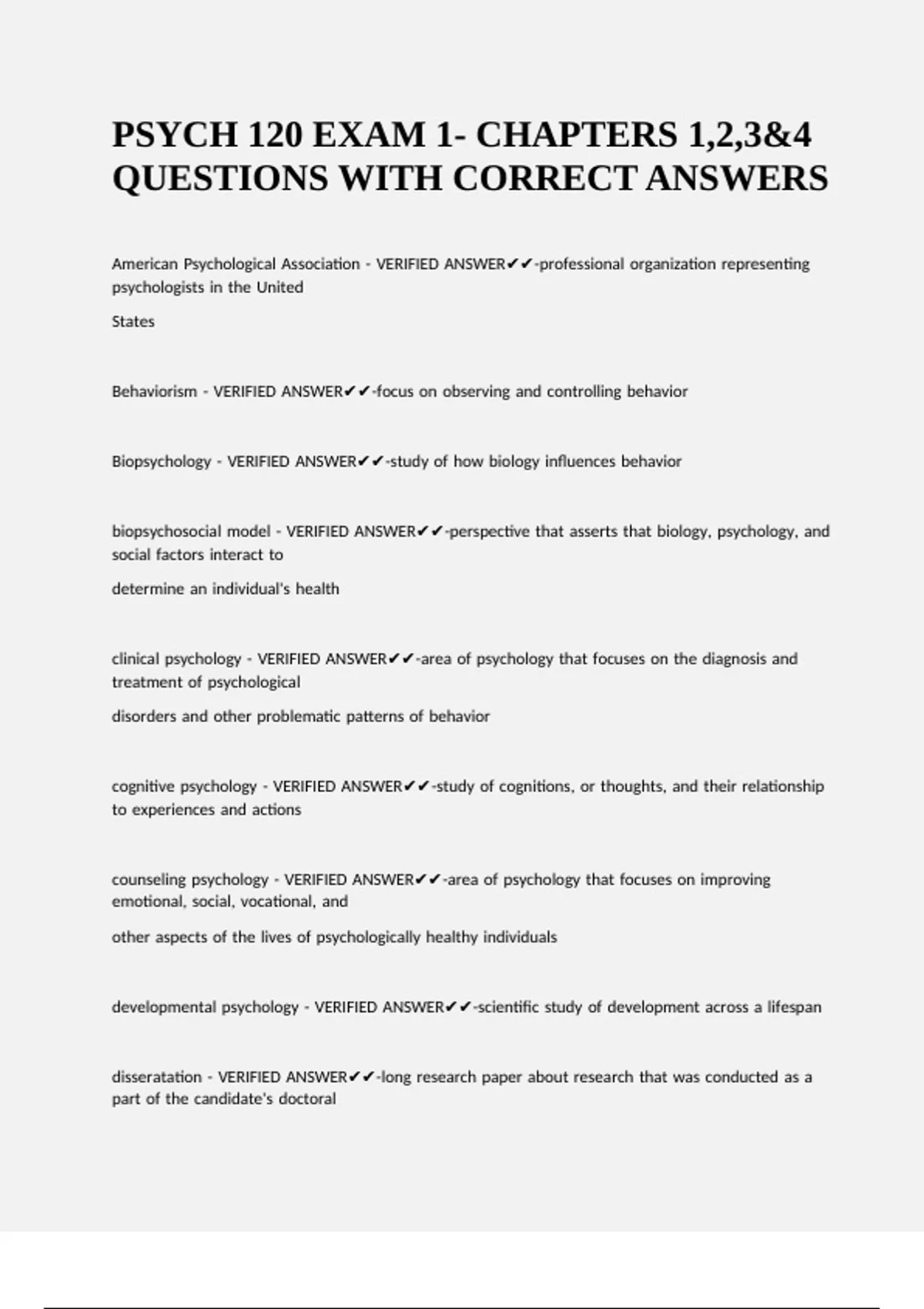clinical |psychology |- |VERIFIED |ANSWER✔✔-area |of |psychology |that |focuses |on |the |diagnosis |and |