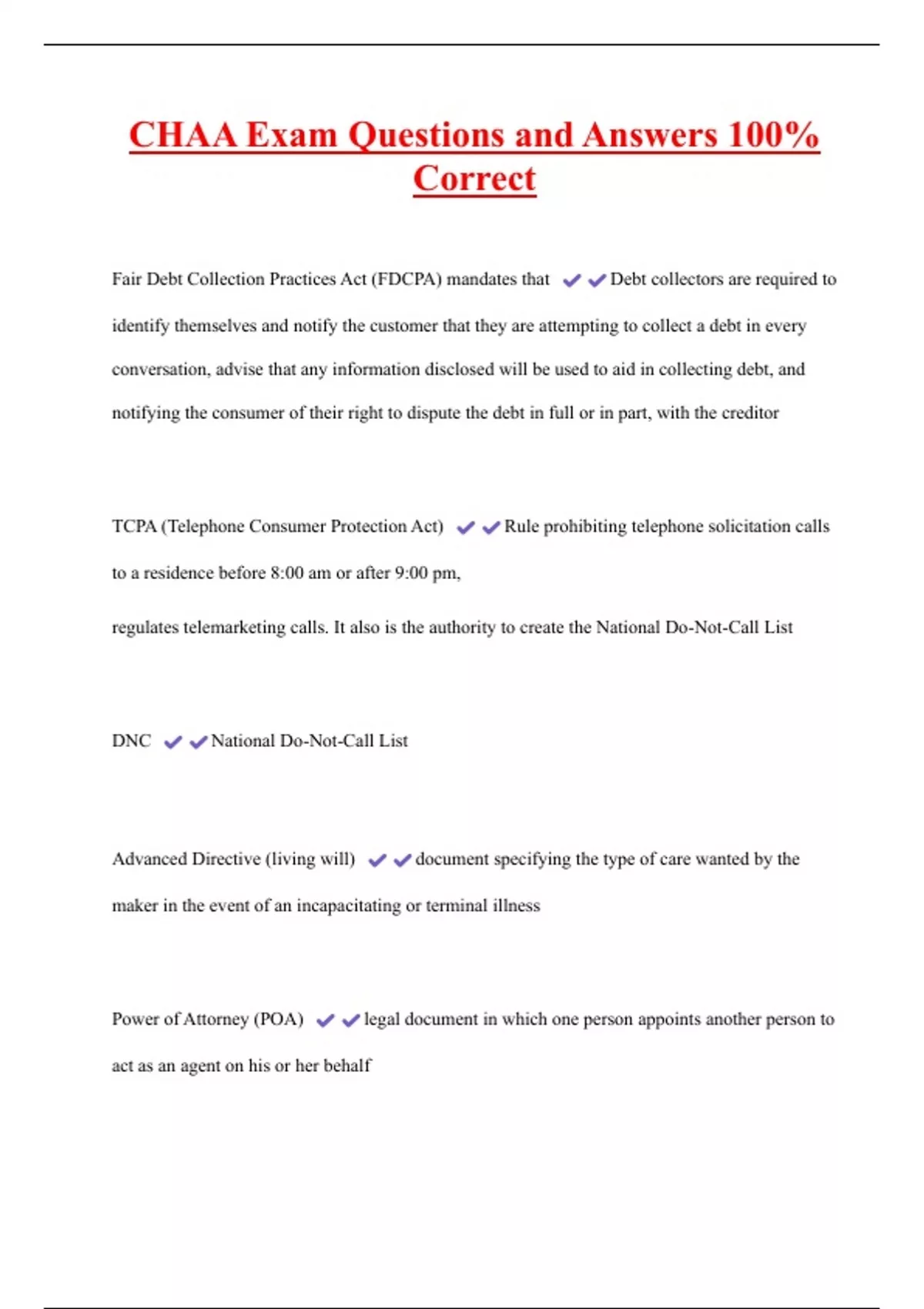 CHAA Exam Questions and Answers 100% Correct Fair Debt Collection Practices Act (FDCPA) mandates that Debt collectors are required to identify themselves and notify the customer that they are attempting to collect a debt in every conversation, advise that any information disclosed will be used to aid in collecting debt, and notifying the consumer of their right to dispute the debt in full or in part, with the creditor TCPA (Telephone Consumer Protection Act) Rule prohibiting telephone solicitation calls to a residence before 8:00 am or after 9:00 pm, regulates telemarketing calls. It also is the authority to create the National Do-Not-Call List