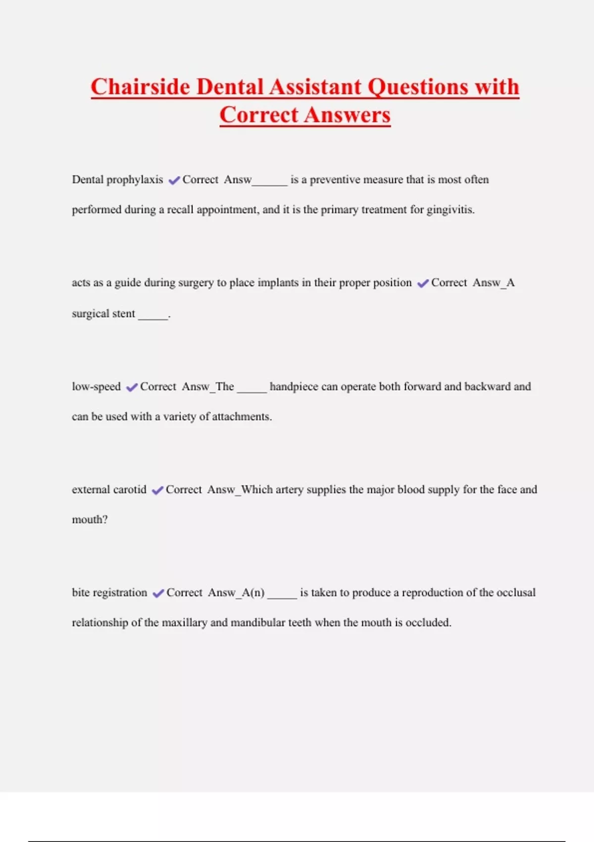 Chairside Dental Assistant Questions with Correct Answers Dental prophylaxis Correct Answ______ is a preventive measure that is most often performed during a recall appointment, and it is the primary treatment for gingivitis. acts as a guide during surgery to place implants in their proper position Correct Answ_A surgical stent _____. low-speed Correct Answ_The _____ handpiece can operate both forward and backward and can be used with a variety of attachments.
