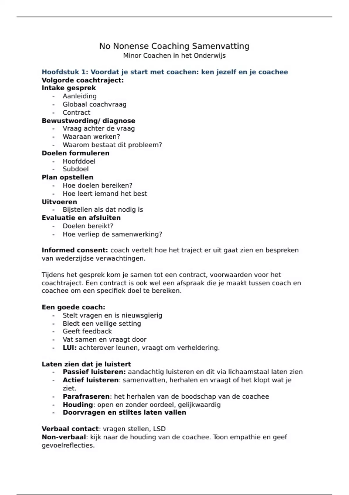 Dit is een samenvatting vanuit mijn minor Coachen in het Onderwijs. Het tentamen bestaat uit twee delen waaronder No Nonsense Coaching, waar deze samenvatting voor is. Hoofdstuk 1 tot en met 3 komt aan bod plus een klein stukje over Oplossingsgericht Coachen. Doe er je voordeel mee!
