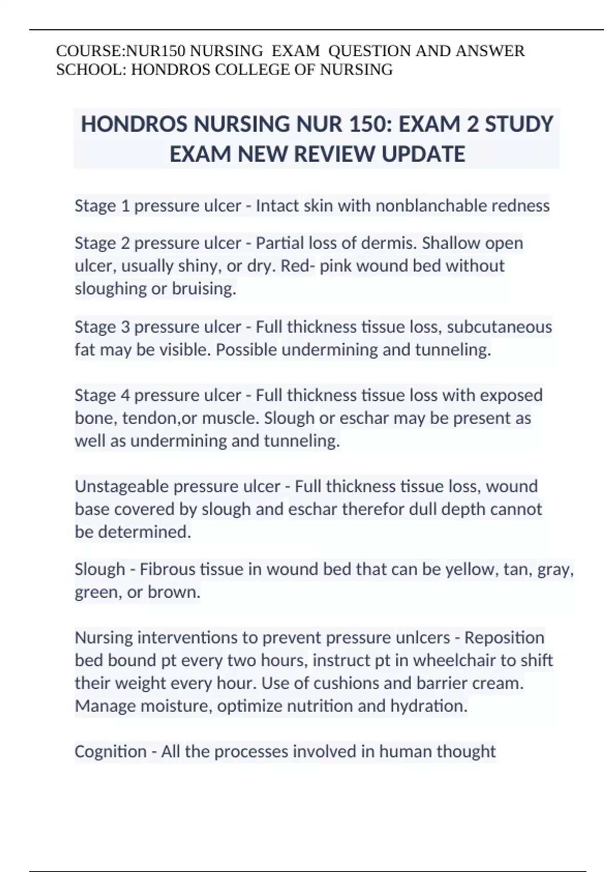 HONDROS NURSING NUR 150: EXAM 2 STUDY