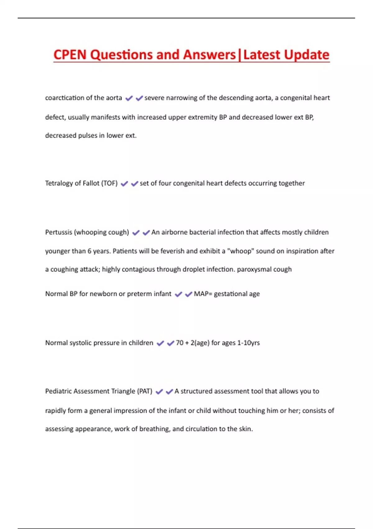 CPEN Questions and Answers|Latest Update coarctication of the aorta severe narrowing of the descending aorta, a congenital heart defect, usually manifests with increased upper extremity BP and decreased lower ext BP, decreased pulses in lower ext. Tetralogy of Fallot (TOF) set of four congenital heart defects occurring together Pertussis (whooping cough) An airborne bacterial infection that affects mostly children younger than 6 years. Patients will be feverish and exhibit a "whoop" sound on inspiration after a coughing attack; highly contagious through droplet infection. paroxysmal cough Normal BP for newborn or preterm infant MAP= gestational age