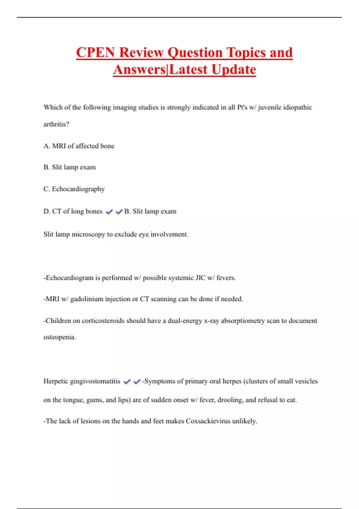 CPEN Review Question Topics and Answers|Latest Update Which of the following imaging studies is strongly indicated in all Pt's w/ juvenile idiopathic arthritis? A. MRI of affected bone B. Slit lamp exam C. Echocardiography D. CT of long bones B. Slit lamp exam Slit lamp microscopy to exclude eye involvement. -Echocardiogram is performed w/ possible systemic JIC w/ fevers. -MRI w/ gadolinium injection or CT scanning can be done if needed. -Children on corticosteroids should have a dual-energy x-ray absorptiometry scan to document osteopenia