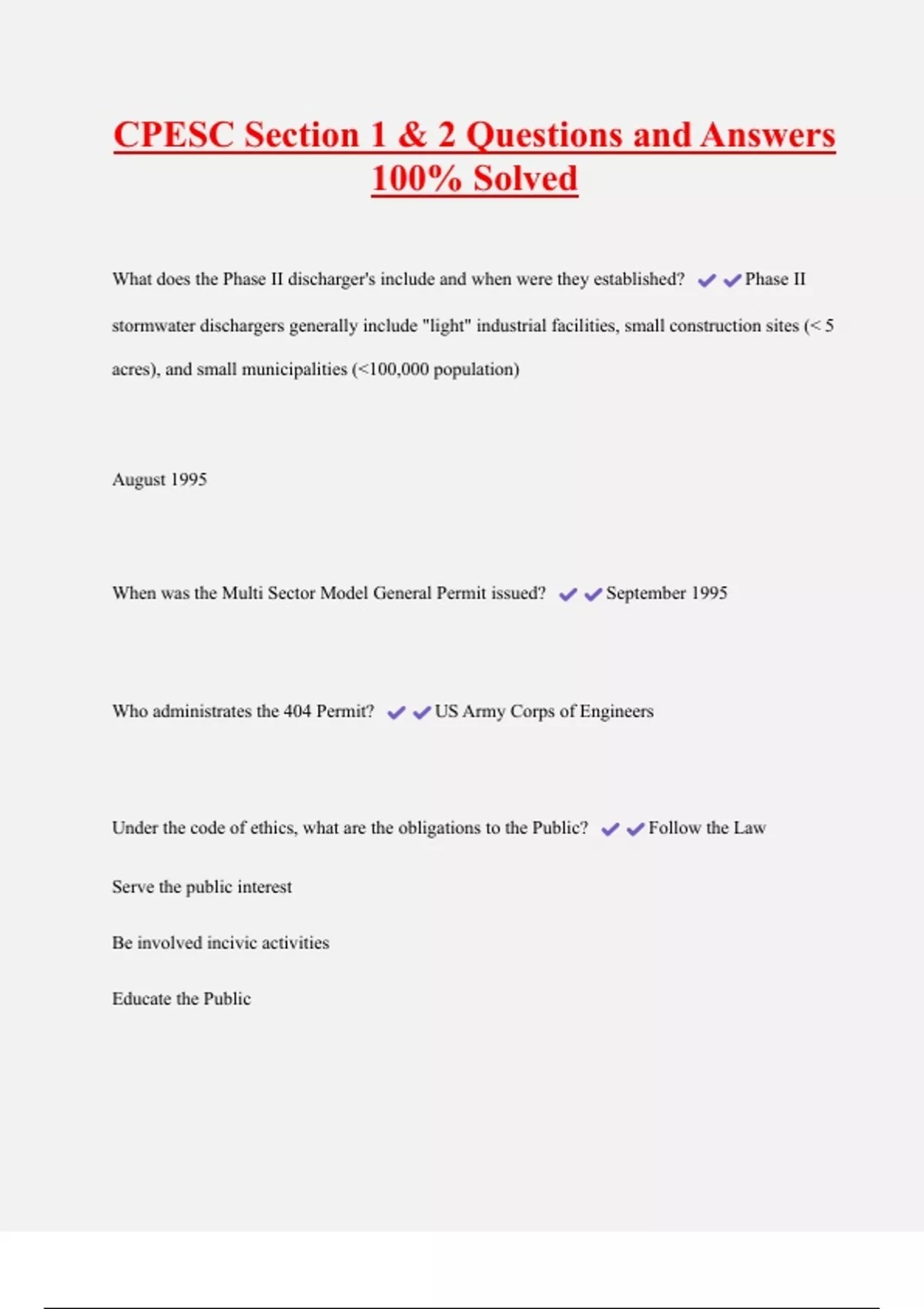 CPESC Section 1 & 2 Questions and Answers 100% Solved What does the Phase II discharger's include and when were they established? Phase II stormwater dischargers generally include "light" industrial facilities, small construction sites ( 5 acres), and small municipalities (100,000 population) August 1995 When was the Multi Sector Model General Permit issued? September 1995 Who administrates the 404 Permit? US Army Corps of Engineers