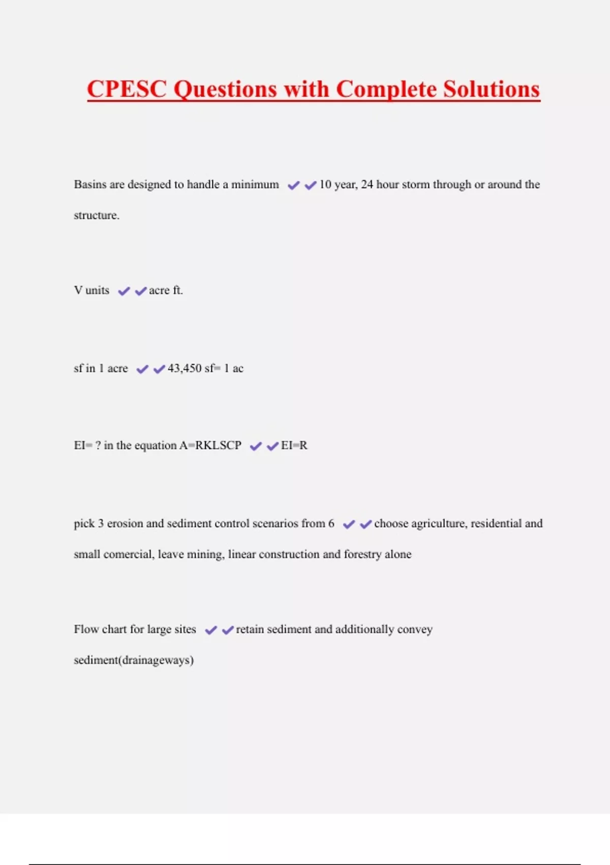 CPESC Questions with Complete Solutions Basins are designed to handle a minimum 10 year, 24 hour storm through or around the structure. V units acre ft. sf in 1 acre 43,450 sf= 1 ac EI= ? in the equation A=RKLSCP EI=R