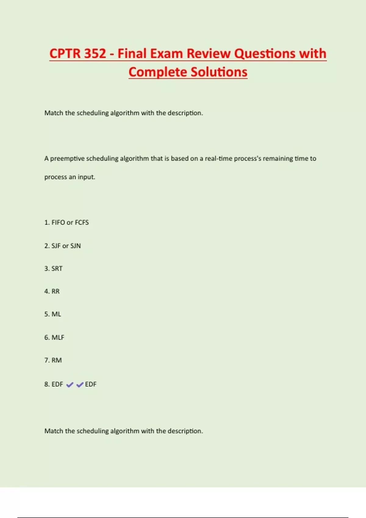 CPTR 352 - Final Exam Review Questions with Complete Solutions Match the scheduling algorithm with the description. A preemptive scheduling algorithm that is based on a real-time process's remaining time to process an input. 1. FIFO or FCFS 2. SJF or SJN 3. SRT 4. RR 5. ML 6. MLF 7. RM 8. EDF EDF