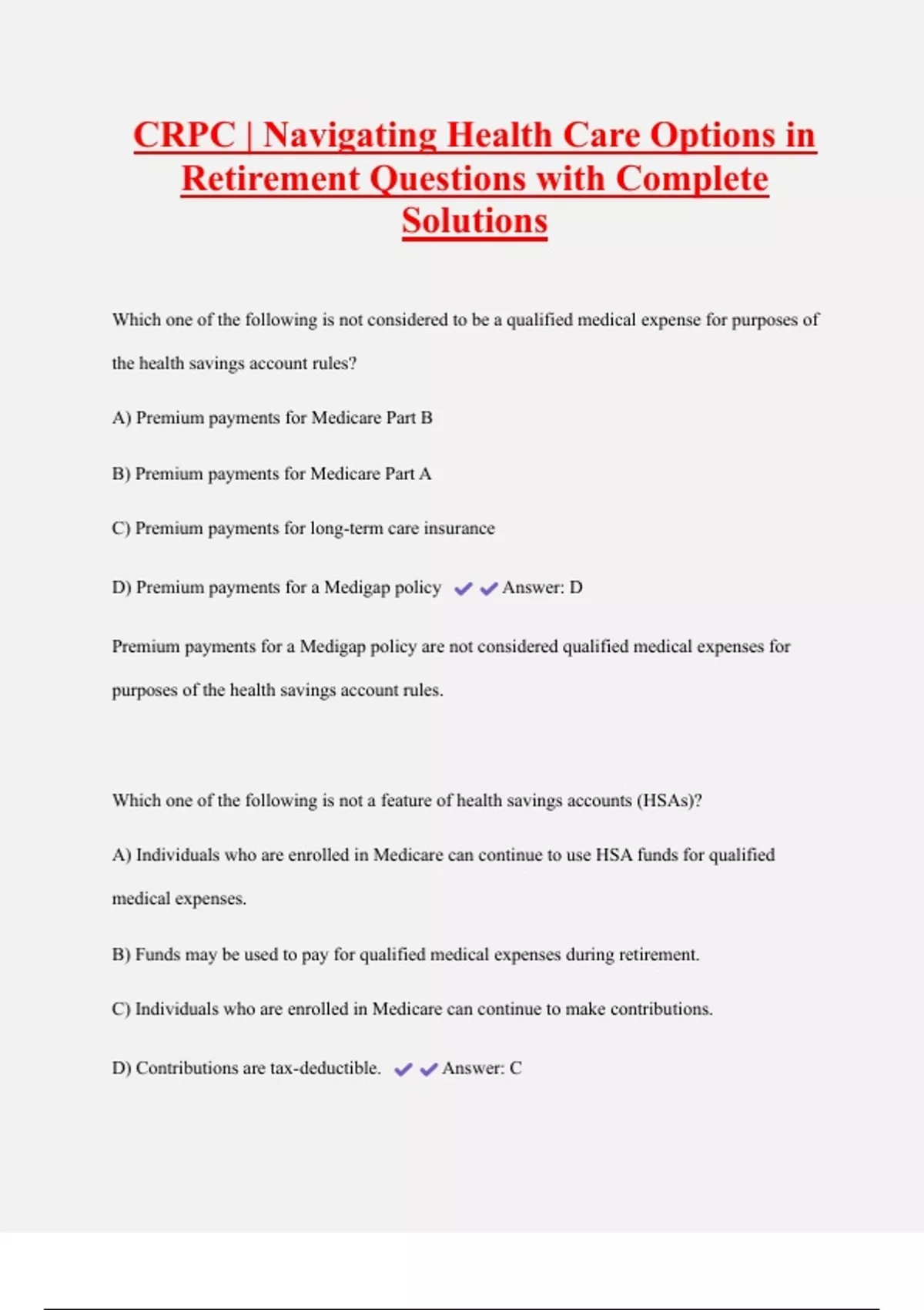 CRPC | Navigating Health Care Options in Retirement Questions with Complete Solutions Which one of the following is not considered to be a qualified medical expense for purposes of the health savings account rules? A) Premium payments for Medicare Part B B) Premium payments for Medicare Part A C) Premium payments for long-term care insurance D) Premium payments for a Medigap policy Answer: D Premium payments for a Medigap policy are not considered qualified medical expenses for purposes of the health savings account rules.