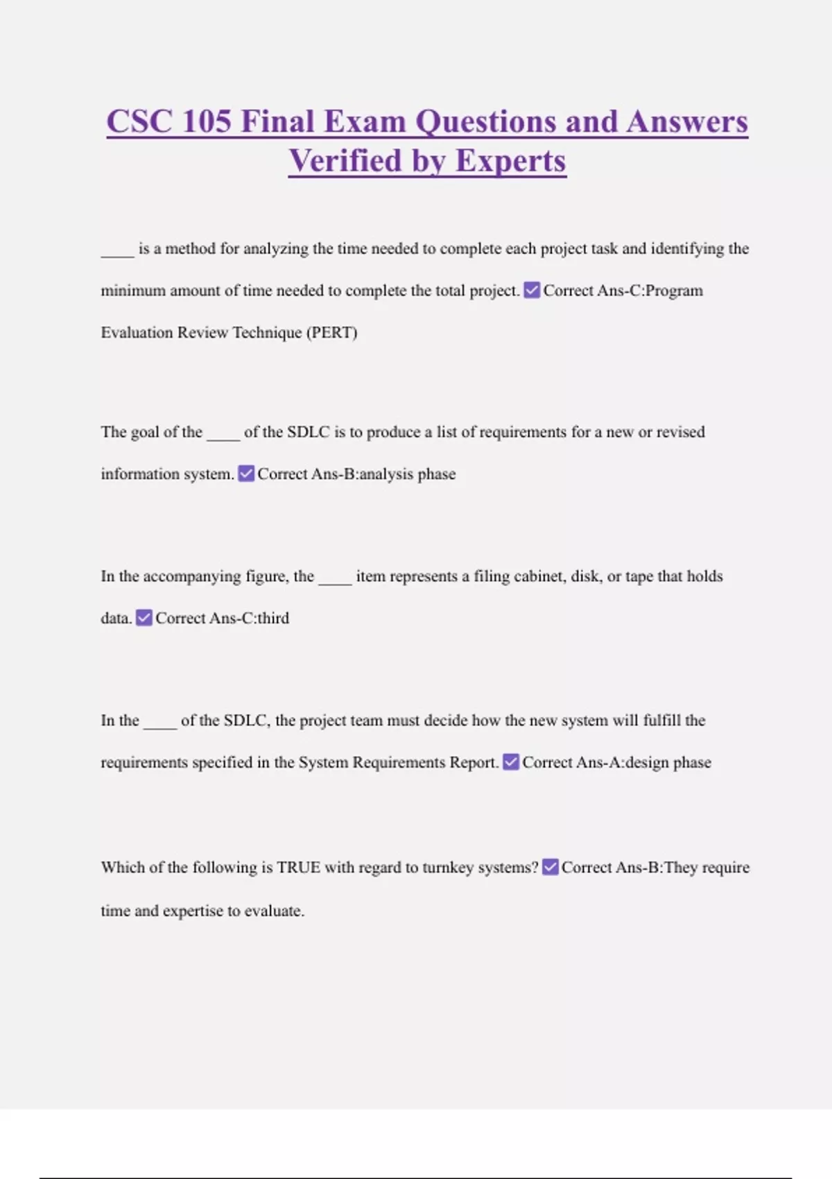 CSC 105 Final Exam Questions and Answers Verified by Experts ____ is a method for analyzing the time needed to complete each project task and identifying the minimum amount of time needed to complete the total project. Correct Ans-C:Program Evaluation Review Technique (PERT) The goal of the ____ of the SDLC is to produce a list of requirements for a new or revised information system. Correct Ans-B:analysis phase