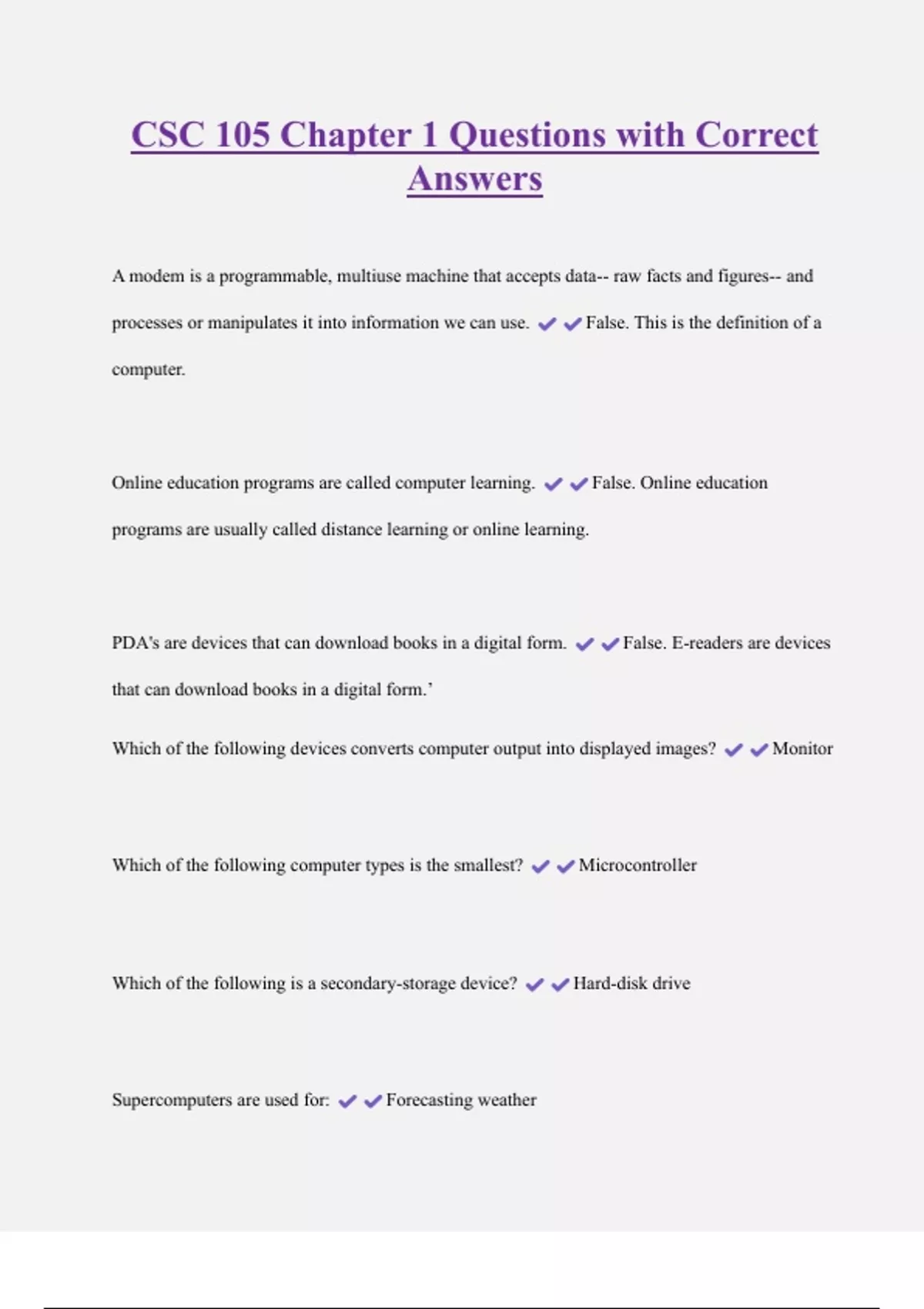 CSC 105 Chapter 1 Questions with Correct Answers A modem is a programmable, multiuse machine that accepts data-- raw facts and figures-- and processes or manipulates it into information we can use. False. This is the definition of a computer. Online education programs are called computer learning. False. Online education programs are usually called distance learning or online learning
