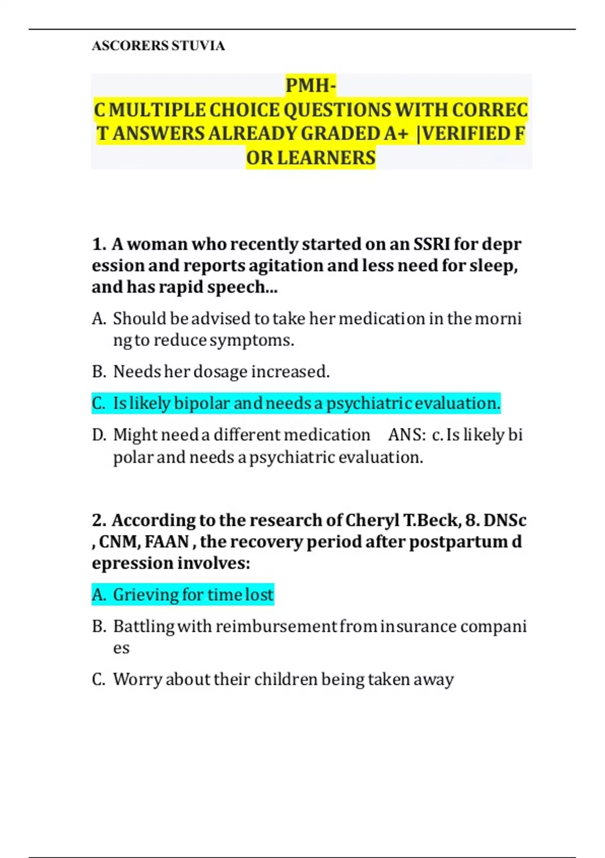 PMH C PRACTICE EXAM PMH C LATEST UPDATED EXAM STUDY GUIDE COMPLETE ACTUAL EXAM REAL QUESTIONS AND CORRECT ANSWERS (100% CORRECT VERIFIED SOLUTIONS) A NEW UPDATED VERSIONS