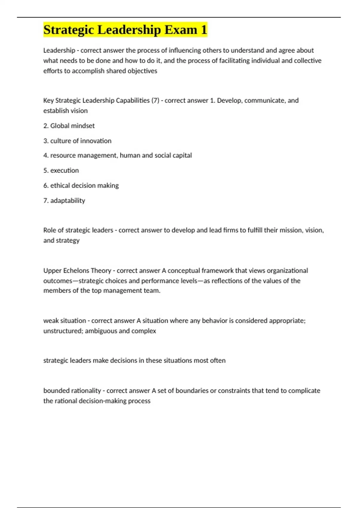 Leadership - correct answer the process of influencing others to understand and agree about what needs to be done and how to do it, and the process of facilitating individual and collective efforts to accomplish shared objectives Key Strategic Leadership Capabilities (7) - correct answer 1. Develop, communicate, and establish vision 2. Global mindset 3. culture of innovation 4. resource management, human and social capital 5. execution 6. ethical decision making 7. adaptability Role of strategic leaders - correct answer to develop and lead firms to fulfill their mission, vision, and strategy Upper Echelons Theory - correct answer A conceptual framework that views organizational outcomes—strategic choices and performance levels—as reflections of the values of the members of the top management team. weak situation - correct answer A situation where any behavior is considered appropriate; unstructured; ambiguous and complex strategic leaders make decisions in these situations most often bounded rationality - correct answer A set of boundaries or constraints that tend to complicate the rational decision-making process