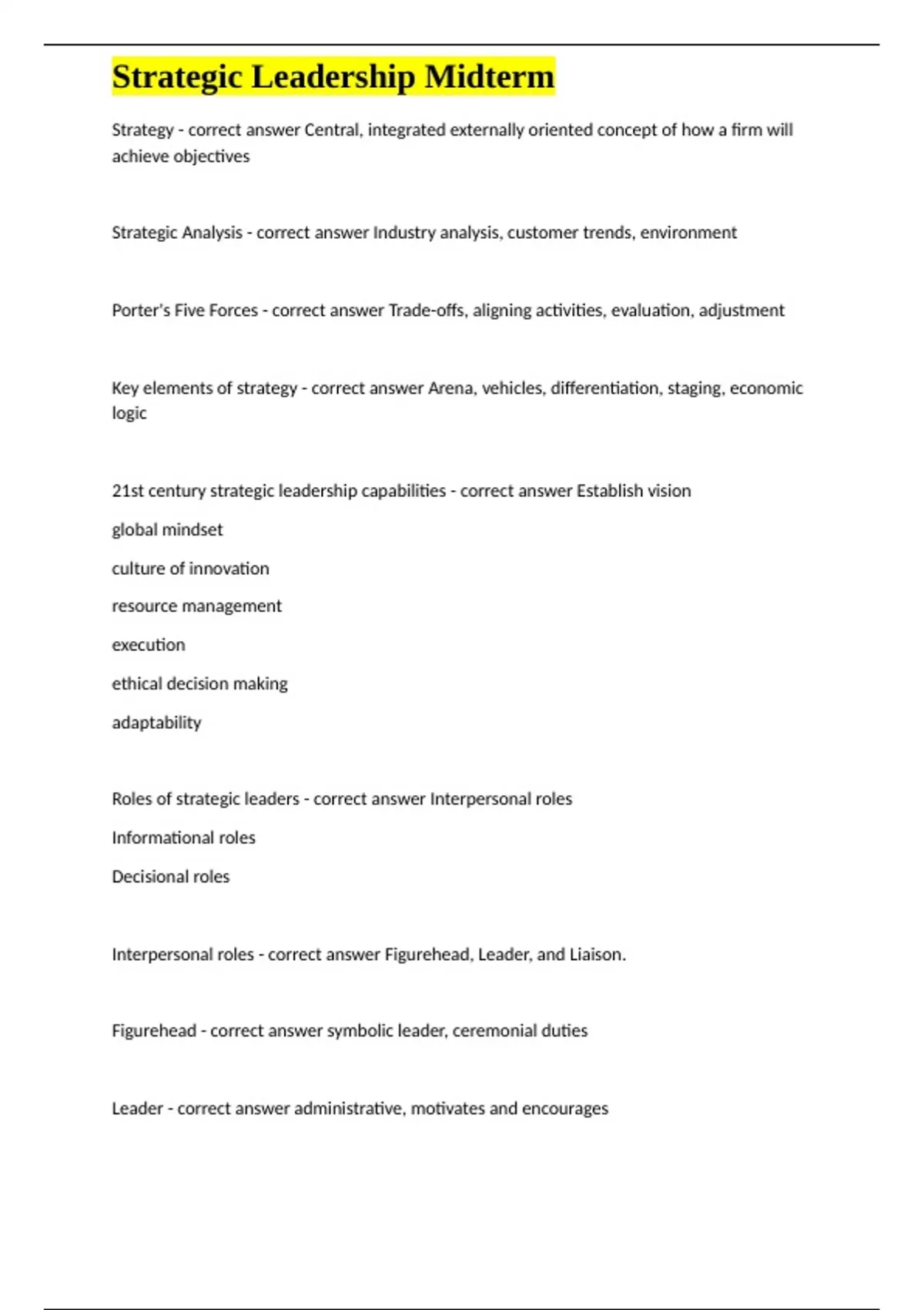 Strategy - correct answer Central, integrated externally oriented concept of how a firm will achieve objectives Strategic Analysis - correct answer Industry analysis, customer trends, environment Porter's Five Forces - correct answer Trade-offs, aligning activities, evaluation, adjustment Key elements of strategy - correct answer Arena, vehicles, differentiation, staging, economic logic 21st century strategic leadership capabilities - correct answer Establish vision global mindset culture of innovation resource management execution ethical decision making adaptability Roles of strategic leaders - correct answer Interpersonal roles Informational roles Decisional roles Interpersonal roles - correct answer Figurehead, Leader, and Liaison. Figurehead - correct answer symbolic leader, ceremonial duties