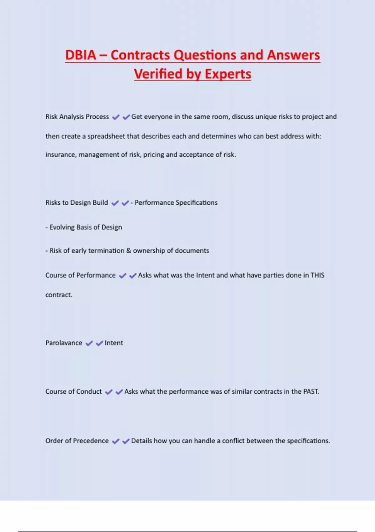 DBIA – Contracts Questions and Answers Verified by Experts Risk Analysis Process Get everyone in the same room, discuss unique risks to project and then create a spreadsheet that describes each and determines who can best address with: insurance, management of risk, pricing and acceptance of risk. Risks to Design Build - Performance Specifications - Evolving Basis of Design - Risk of early termination & ownership of documents Course of Performance Asks what was the Intent and what have parties done in THIS contract