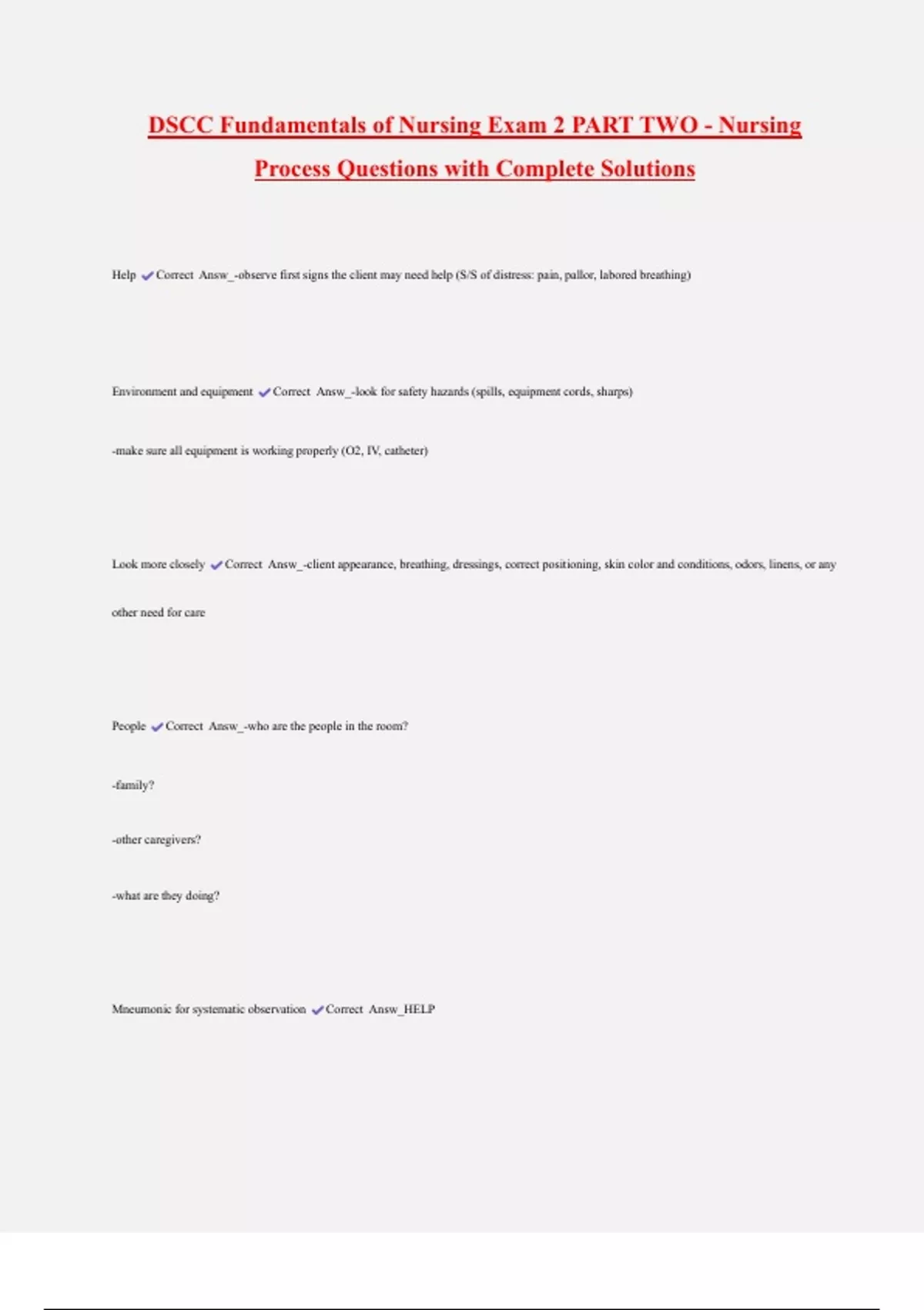 Look more closely Correct Answ_-client appearance, breathing, dressings, correct positioning, skin color and conditions, odors, linens, or any