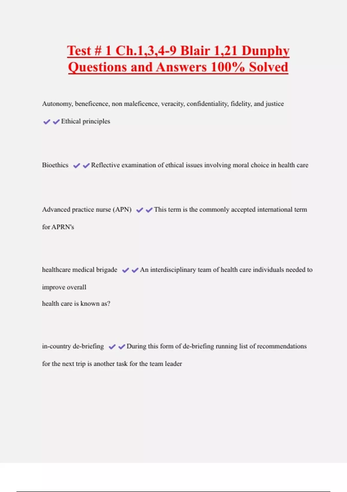 Test # 1 Ch.1,3,4-9 Blair 1,21 Dunphy Questions and Answers 100% Solved Autonomy, beneficence, non maleficence, veracity, confidentiality, fidelity, and justice Ethical principles Bioethics Reflective examination of ethical issues involving moral choice in health care Advanced practice nurse (APN) This term is the commonly accepted international term for APRN's